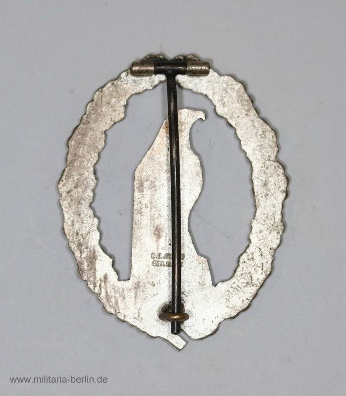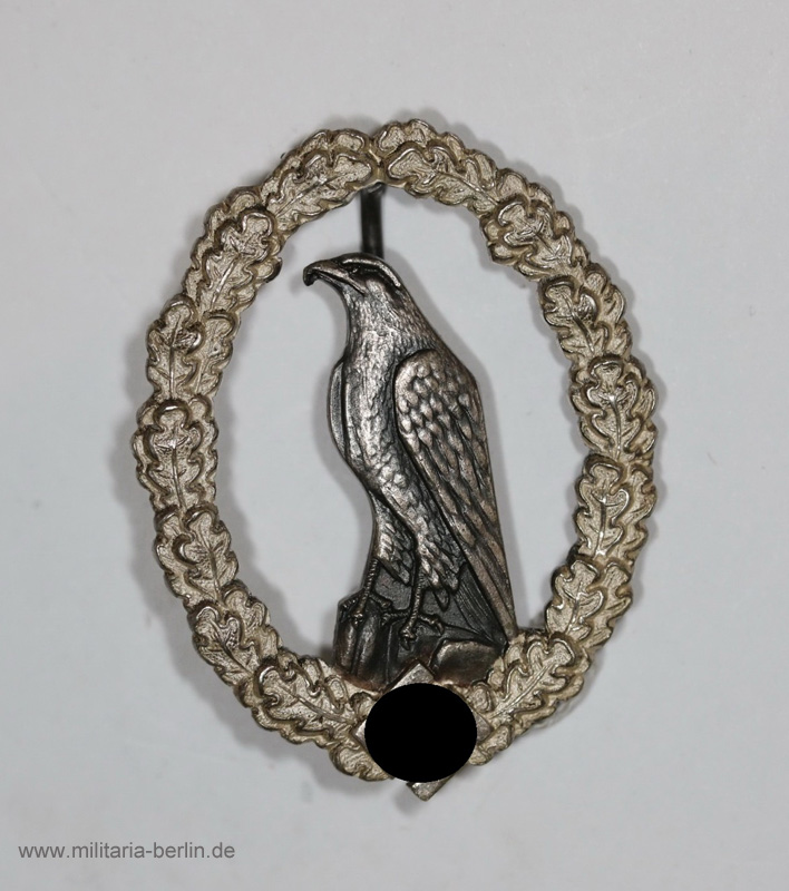 Hochovales Abzeichen aus versilberten Buntmetall. Der Kranz wird gebildet aus Eichenlaub und Lorbeer, jeweils eine Hälfte des Kranzes. Unten mittig das Hakenkreuz mit ausgesägten Kreuzarm. Zentral ein auf einen Felsvorsprung sitzender, detaillierter Adler mit angelegten Flügeln. Nach links blickend. Der Kranz versilbert, der Adler geschwärzt.