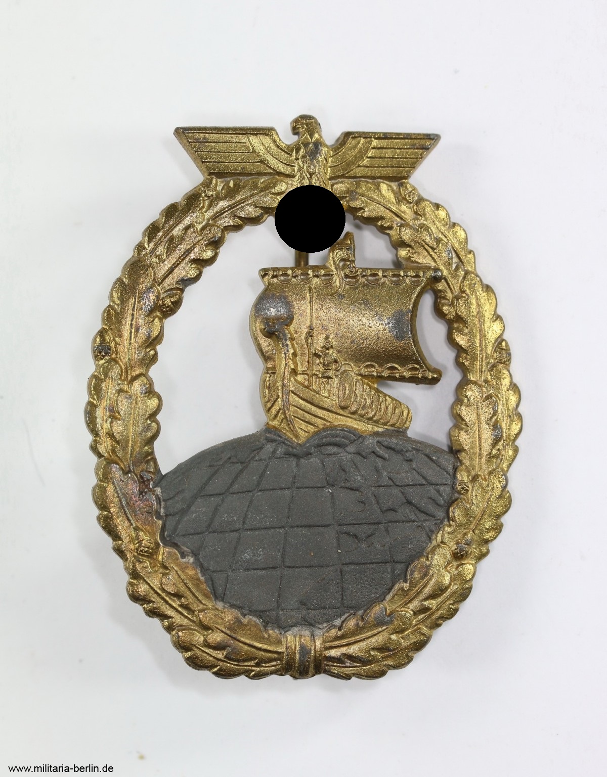Hochovales Abzeichen aus Buntmetall, oder Zink, in einigen besonderen Fällen auch aus Silber (Sterlingsilber). Zentral ein separat aufgelegter Globus. Oben auf den Globus ein stilisiertes Wikingerschiff mit gesetzten Segel nach links fahrend. Umgeben durch einen unten gebundenen goldenen Eichenlaubkranz (typisch für alle Marine Abzeichen). Mittig an der höchsten Stelle der Hoheitsadler der Kriegsmarine, mit Hakenkreuz in den Klauen.