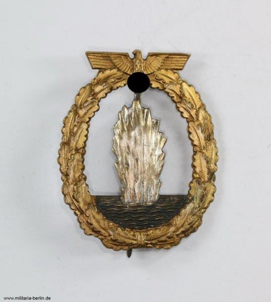 Hochovales Abzeichen aus Buntmetall, bzw. Tombak. Ab 1943 meist nur noch aus Zink. In seltenen Fällen auch aus Aluminium, oder Silber (Sterling). Das Abzeichen zeigt mittig eine Fontäne, als Symbol für eine explodierende Seemine, inmitten des Meeres. Umgeben durch einen unten gebundenen goldenen Eichenkranz (typisch für alle Marine Abzeichen). Mittig an der höchsten Stelle der Hoheitsadler der Kriegsmarine, mit Hakenkreuz in den Klauen. Der Entwurf des Abzeichens stammte vom Berliner Grafiker und Bildhauer Otto Placzek.