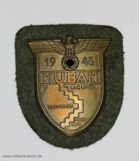 Ein in der typischen Form eines Wappenschildes ausgestanztes Blech Schild. Der bronzierte Schild zeigt im oberen Bereich den Hoheitsadler mit Hakenkreuz in den Klauen. Unterhalb der Schwingen des Adlers die Jahreszahl „1943“ . Darunter der Schriftzug „KUBAN“ . Im Feld darunter eine Zickzacklinie die symbolisch den Frontverlauf darstellt. Rechts und links neben dieser Linie die Ortsnamen der großen Schlachten um den Kuban Brückenkopf, „LAGUNEN“, „KRYMSKAJA“, „ NOWOROS-SIJSK“. Maße des Schildes selbst ca. 52 x 62 mm, mit Tuchunterlage ca. 64 x 77 mm.