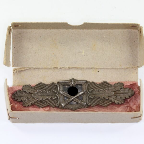 Nahkampfspange in Bronze, Hst. Juncker, in Verleihungsschachtel „Nahkampfspangen bronze“