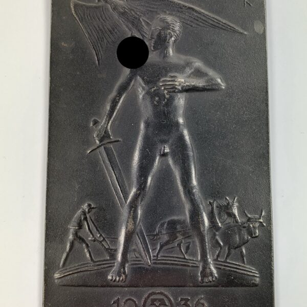 Plakette, Lauchhammer Eisen, Weihnachten 1936, Bauer mit Schwert, Adler mit Hakenkreuz