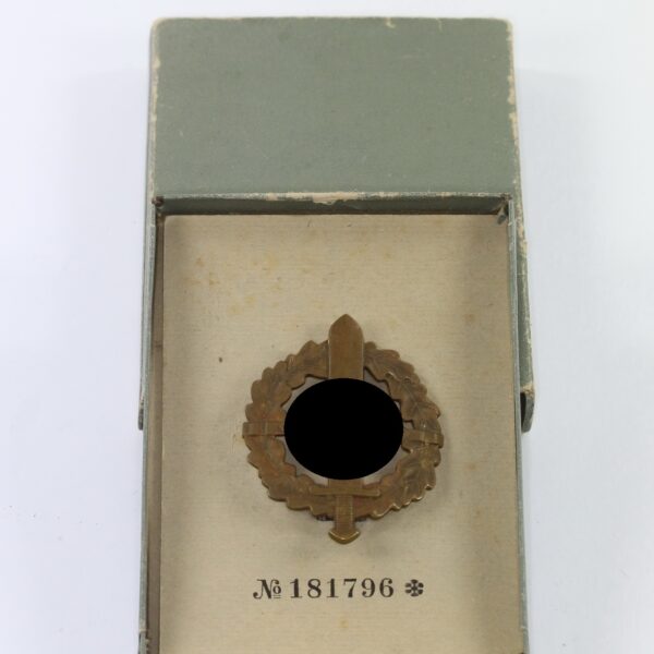 SA-Wehrabzeichen in Bronze, Hst. Schneider, in nummerngleicher (!) Verleihungsschachtel