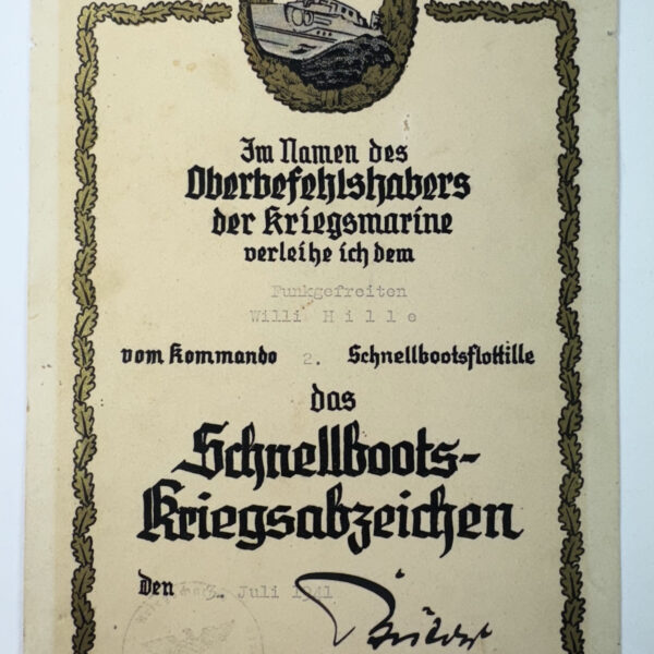 Schmuckurkunde Schnellbootskriegsabzeichen 1. Form, 2. Schnellbootflotille