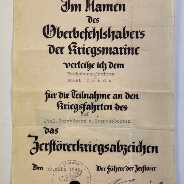 Schmuckurkunde Zerstörerkriegsabzeichen, italenischen Zerstörern (!)
