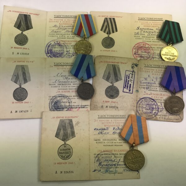 Sowjetunion, Lot 5 Einnahme/Befreiungs Medaillen mit Papieren.