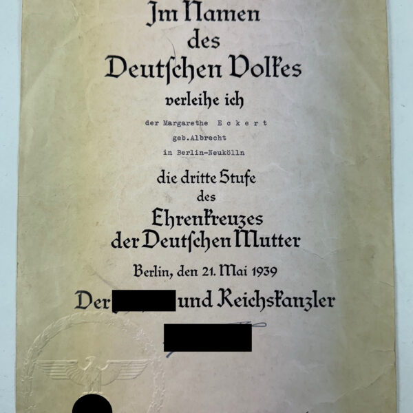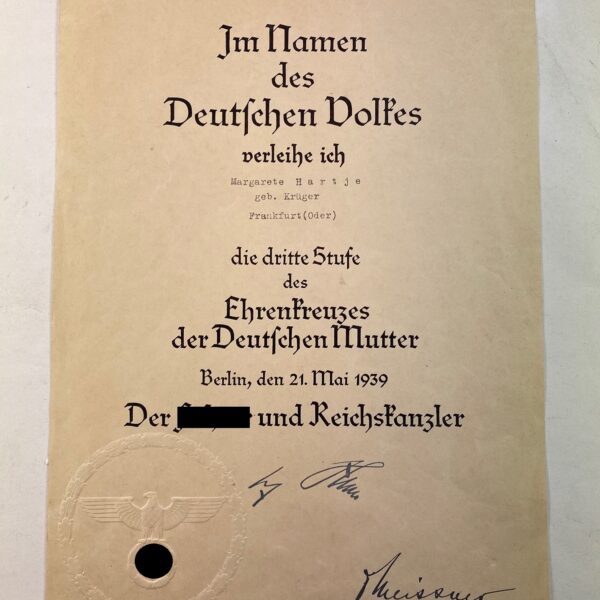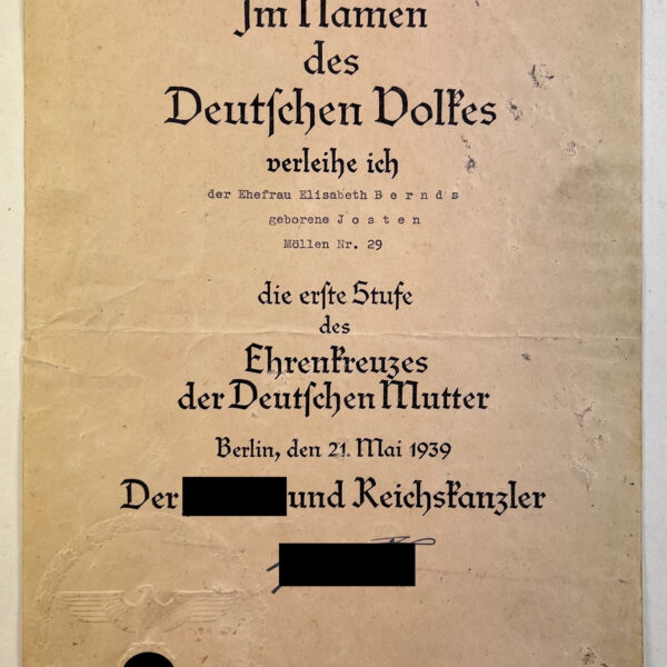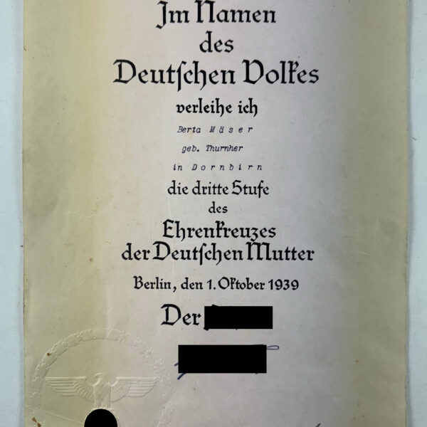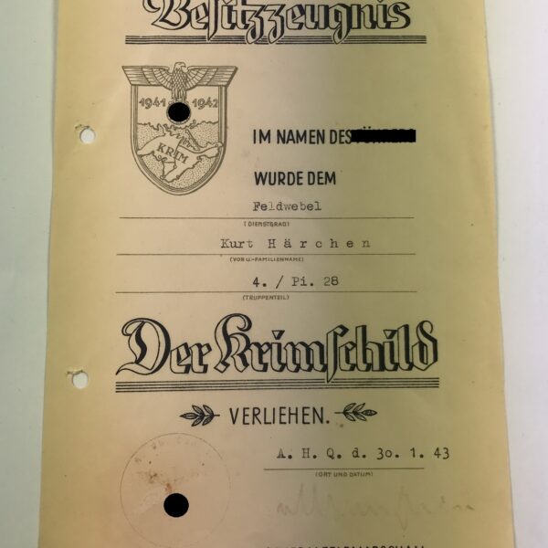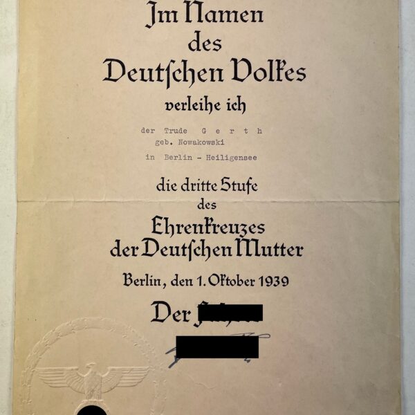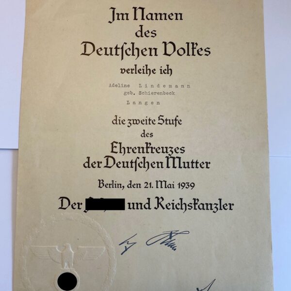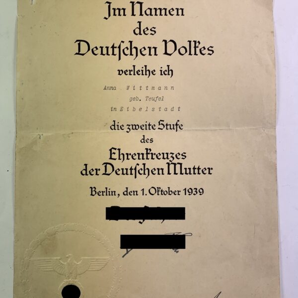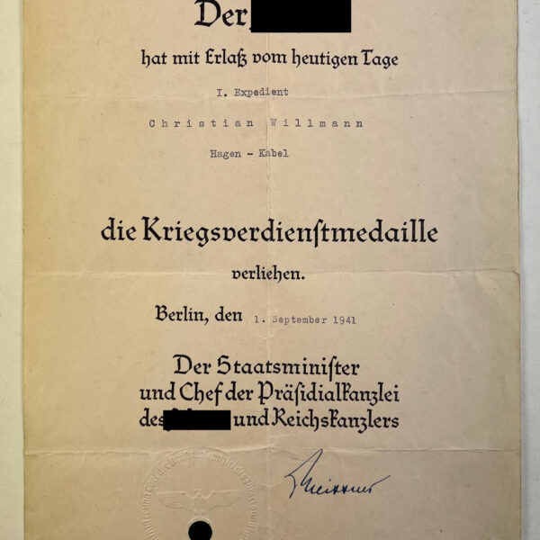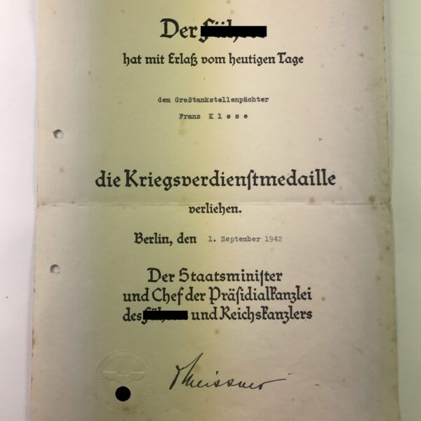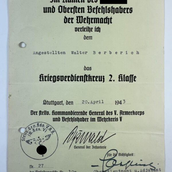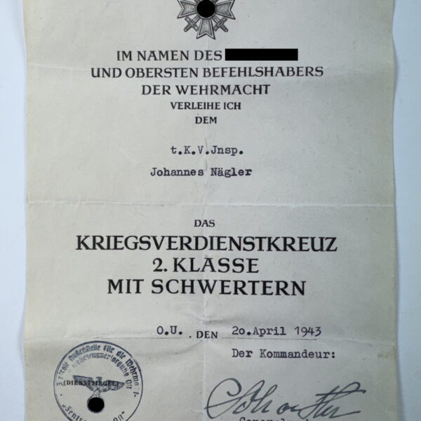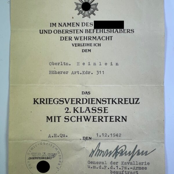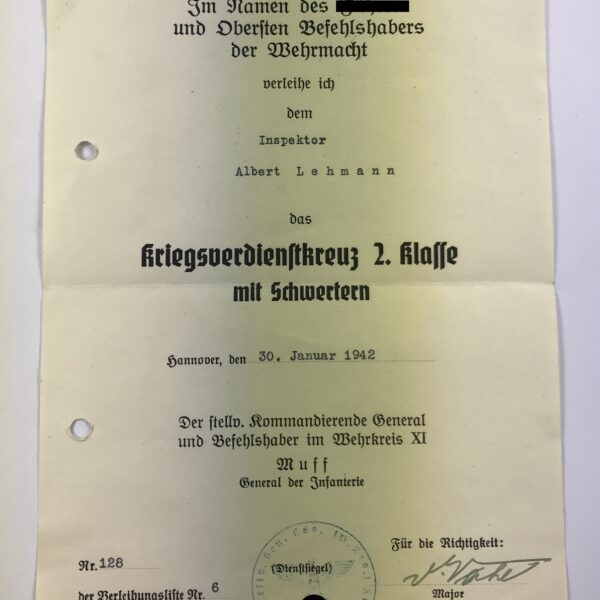 Urkunde Kriegsverdienstkreuz 2. Klasse mit Schwertern, Wehrkreis XI
