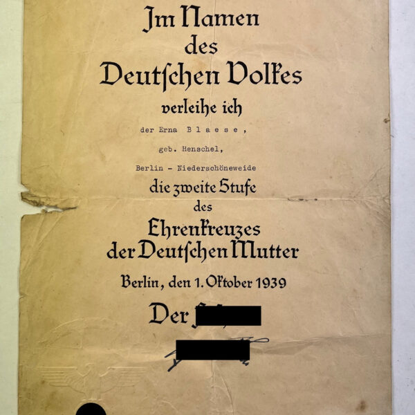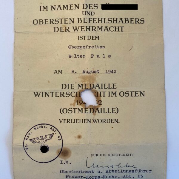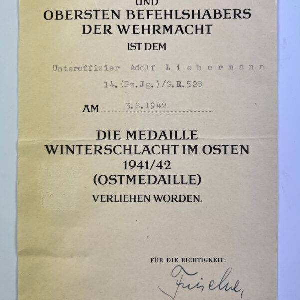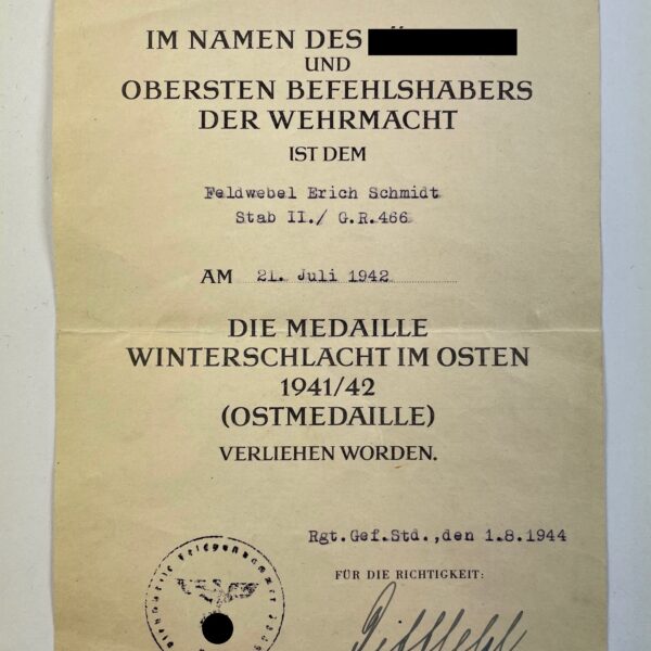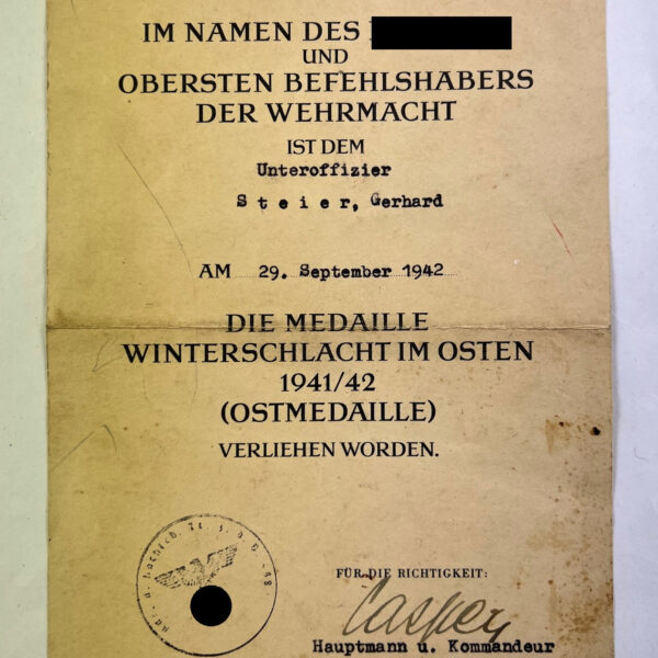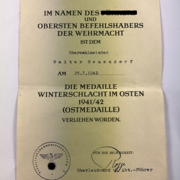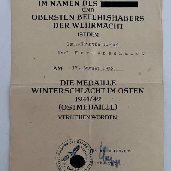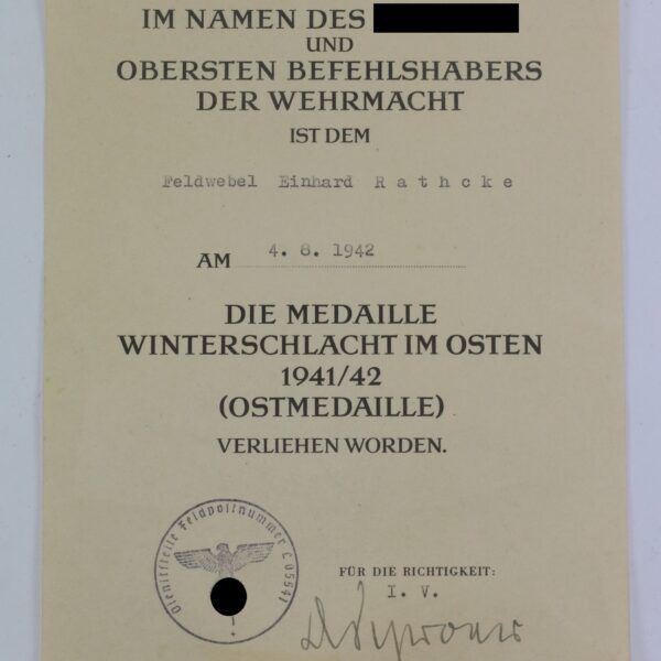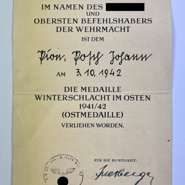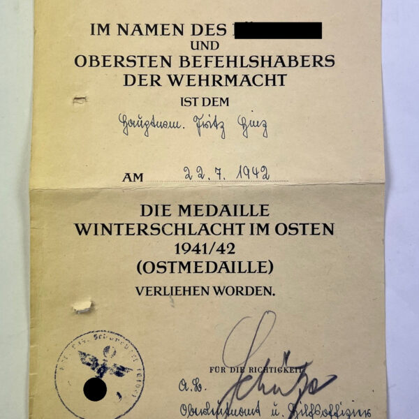 Urkunde Ostmedaille / Medaille Winterschlacht im Osten 1941/42