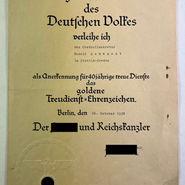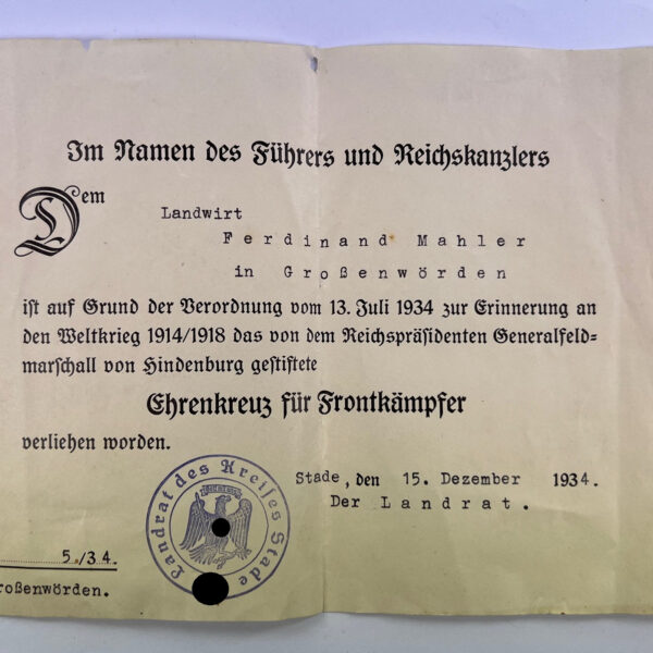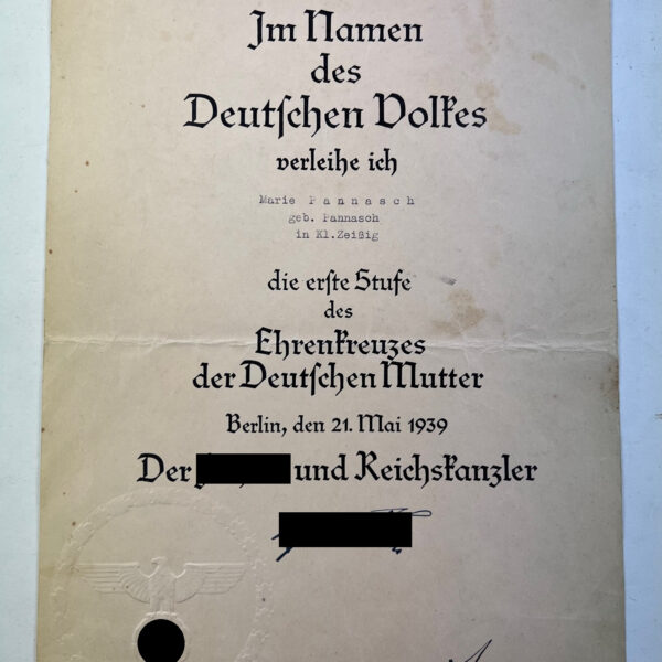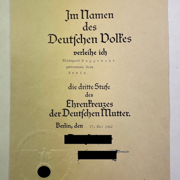 Urkunde, Ehrenkreuz der Deutschen Mutter dritte Stufe (Bronze)