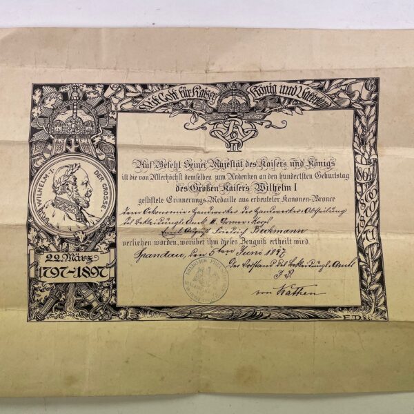 Urkunde, Medaille zum 100.Geburtstag von Kaiser Wilhelm I. (Centenarmedaille)