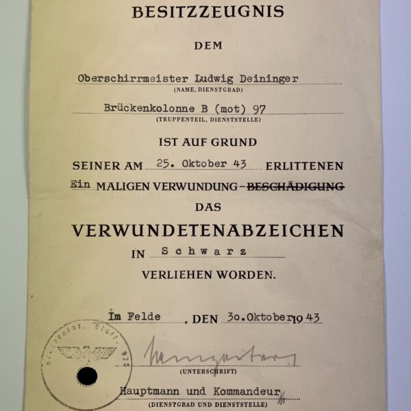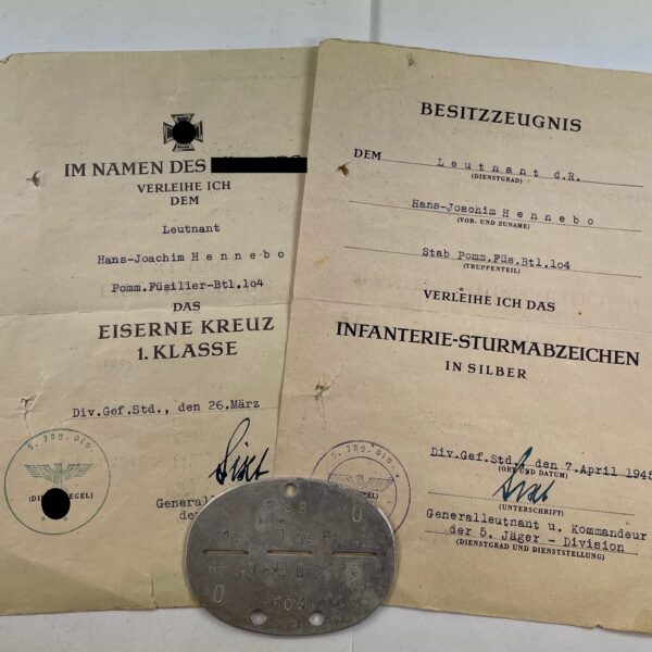 Urkunden + Erkennungsmarke Endkampf 1945 (!), Pommersches Füsilier-Bataillon 104
