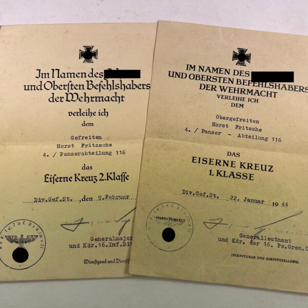 Urkunden Eisernes Kreuz 1. und 2. Klasse Panzer Abteilung 116