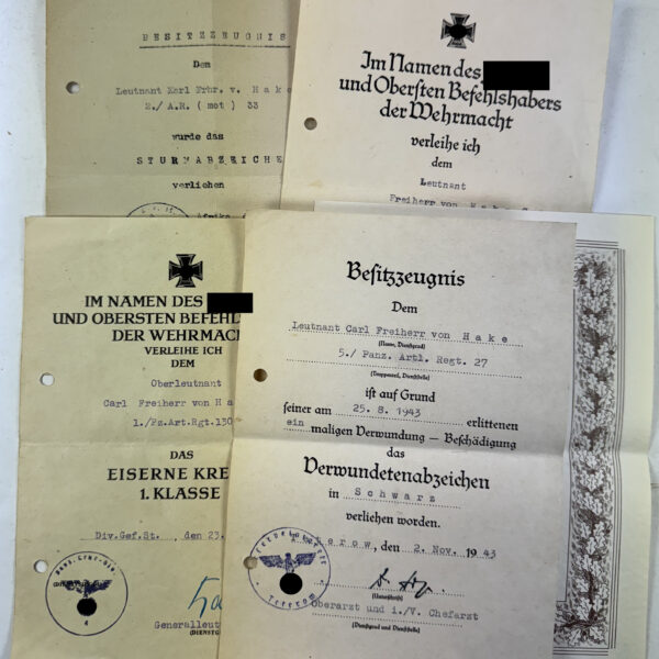 Urkunden Nachlass Freiherr von Hake Panzeraufklärungsabteilung 33, Afrika Normandie