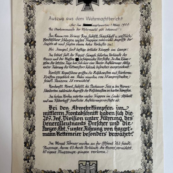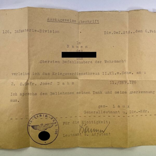 Auszugsweise Abschrift, Kriegsverdienstkreuz 2. Klasse mit Schwertern