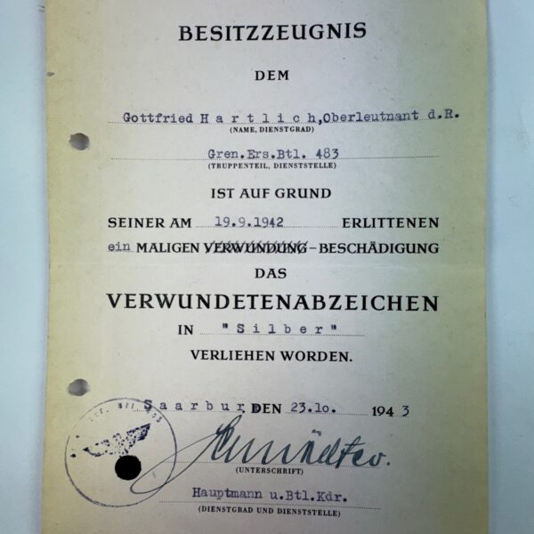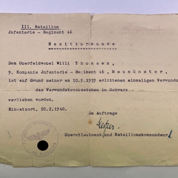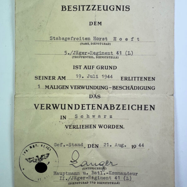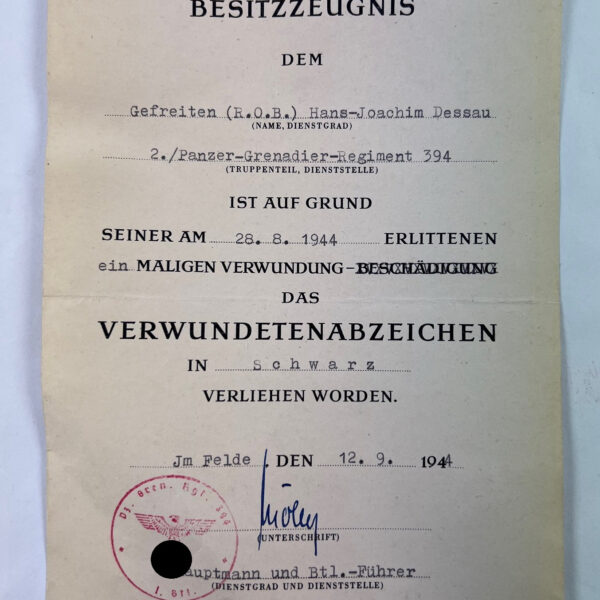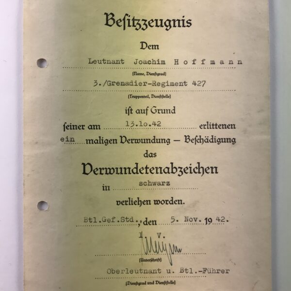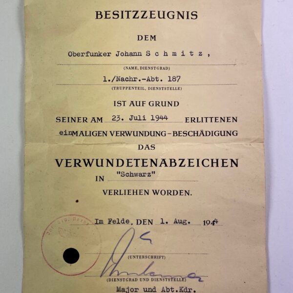 Besitzzeugnis Verwundetenabzeichen in Schwarz 1939, Nachrichten-Abteilung 187