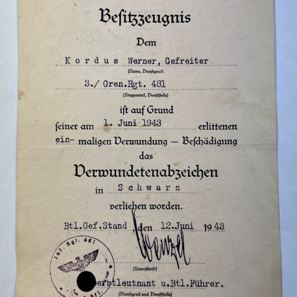 Besitzzeugnis Verwundetenabzeichen in Schwarz 1939, Grenadier Regiment 481