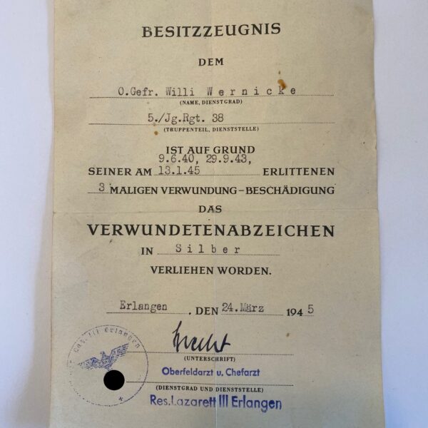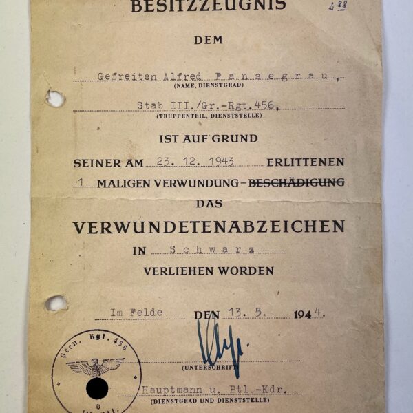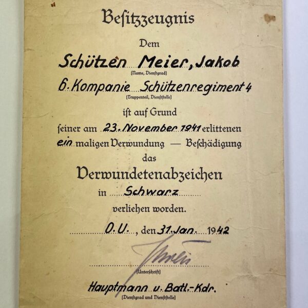 Besitzzeugnis Verwundetenabzeichen Schwarz, Schützenregiment 4