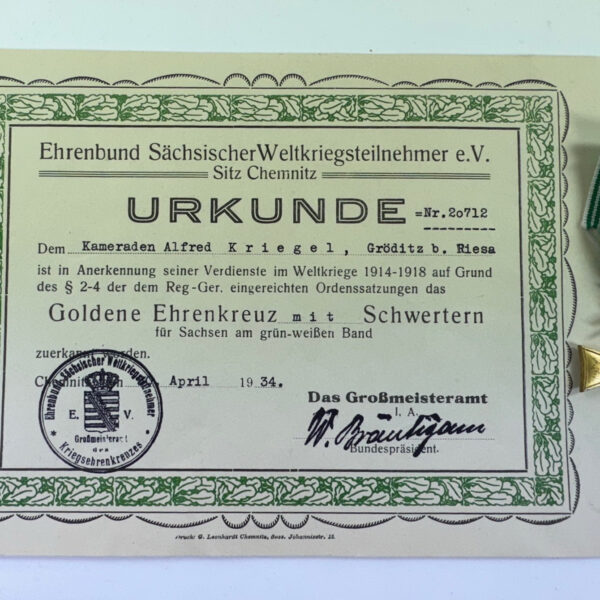 Ehrenkreuz des Ehrenbundes Sächsischen Weltkriegsteilnehmer ´+ Urkunde