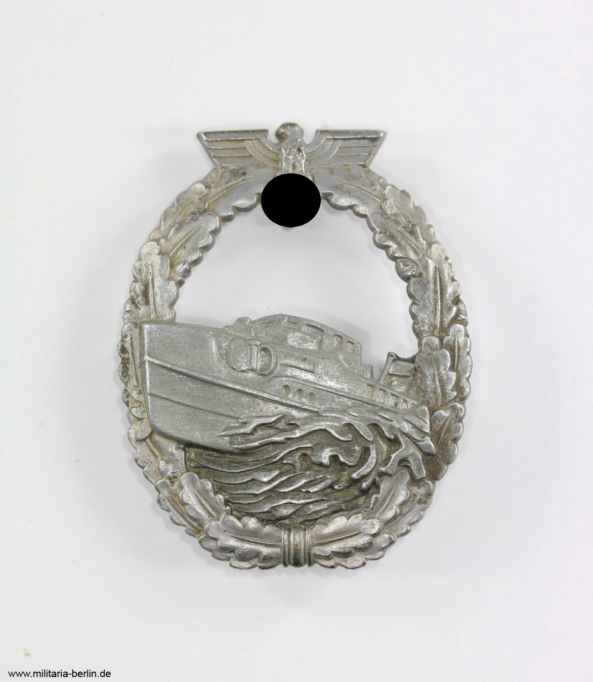 Hochovales Abzeichen aus Buntmetall, bzw. Zink. Zentral ein nach links fahrendes, stilisiertes Schnellboot. Umgeben durch einen unten gebundenen goldenen Eichenkranz (typisch für alle Marine Abzeichen). Mittig an der höchsten Stelle der Hoheitsadler der Kriegsmarine, mit Hakenkreuz in den Klauen. Das Design des Abzeichens wurde 28. Januar 1943 leicht geändert. Viele Schnellbootfahrer beschwerten sich über das etwas „klobig“ dargestellte S-Boot im Abzeichen. Diese Abzeichen mit dem Schnellboot mit den fast geraden Bug, wird als 1. Form bezeichnet. Das neu gestaltete Abzeichen mit dem Boot mit den spitzen Bug wird als 2. Form bezeichnet. Auch der Hoheitsadler der 2. Form wurde wuchtiger, mit weit ausladenden Flügeln gestaltet. Beide Entwürfe stammen von Wilhelm Ernst Peekhaus aus Berlin. Der häufigste Hersteller dieses Abzeichens war die Firma Schwerin Berlin, es gibt aber auch andere.