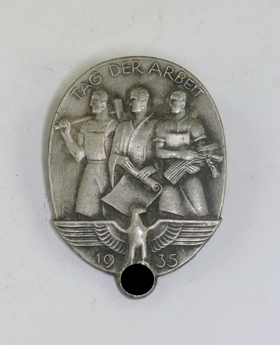 Aluminium, sehr guter, nur leicht getragener Zustand. Ohne Hersteller Markierung. Mit eingequetschter Tragenadel.