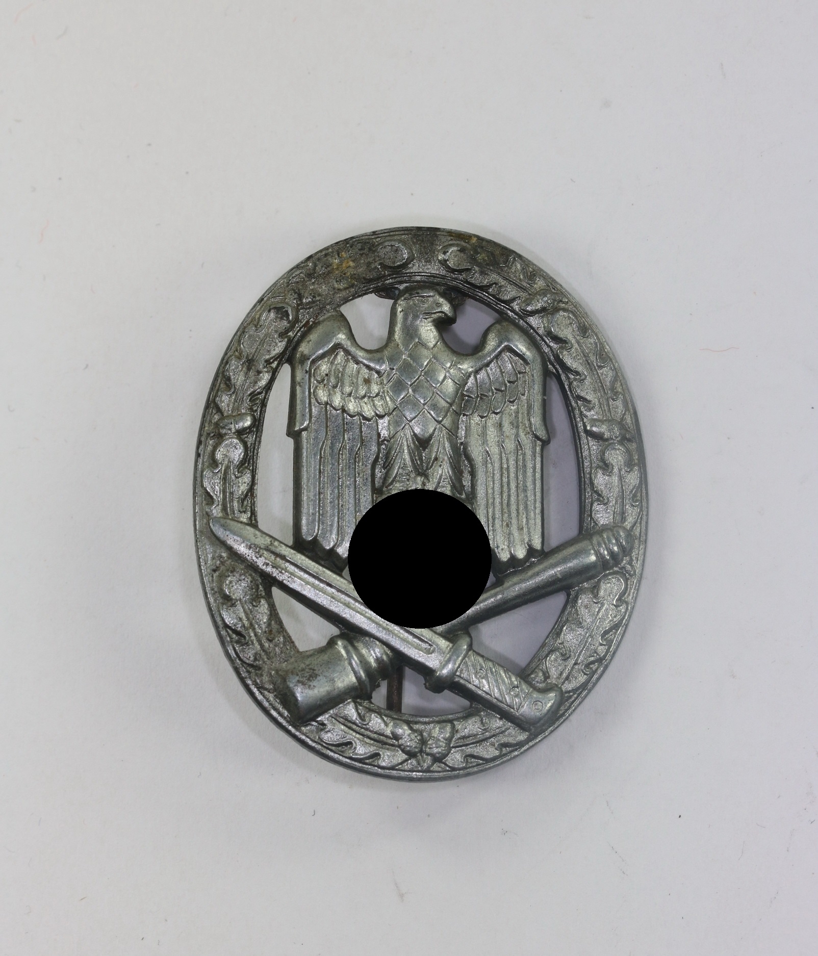 Zink, sehr guter, ungetragener Zustand. Mit vollständiger, typischer chromartiger Versilberung. Ohne Hersteller, aber eine bekannte Variante der Firma Alois Rettenmaier, Schwäbisch Gmünd, auch bekannt als „Flatback” Variante. Siehe GCA-Datenbank.