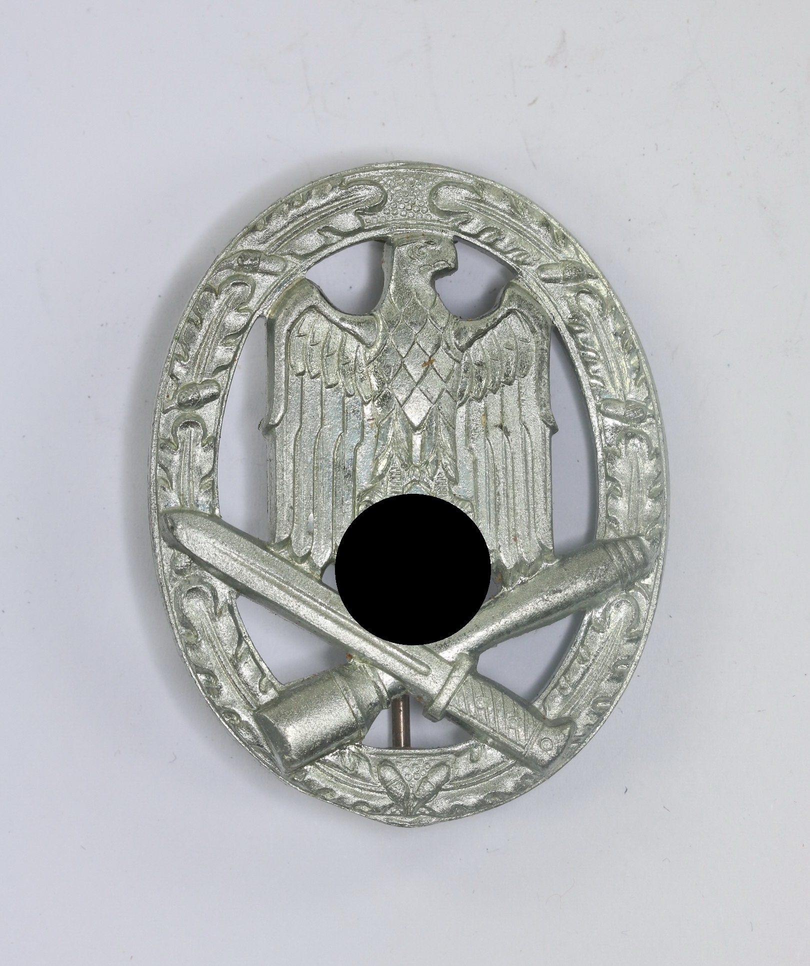 Zink, sehr guter, nur minimal getragener Zustand. Mit vollständiger Versilberung, mit minimalen Ansätzen von Patina. Ohne Hersteller, aber eine bekannte Variante der Firma Biedermann & Co., Oberkassel. Siehe GCA-Datenbank.
