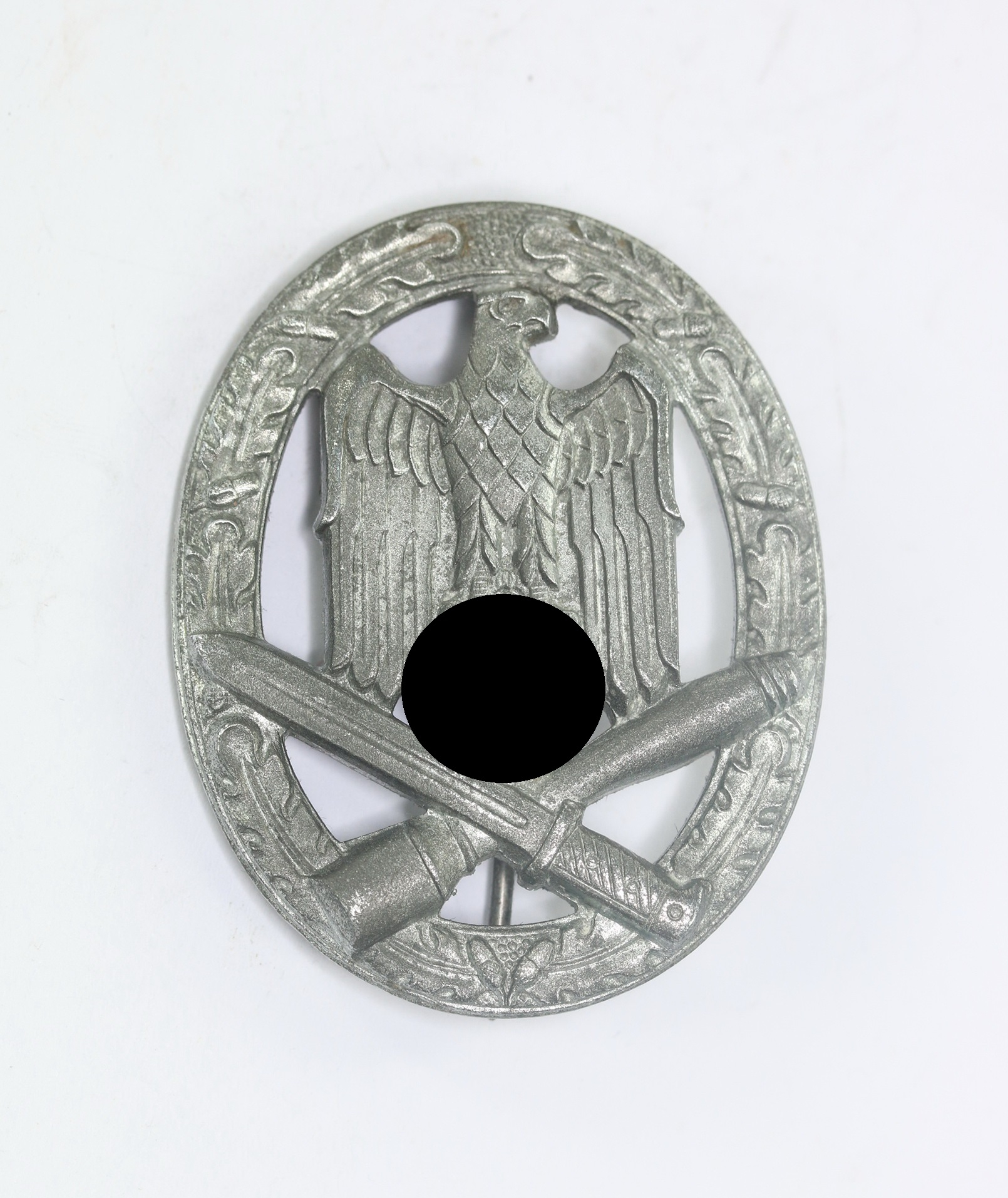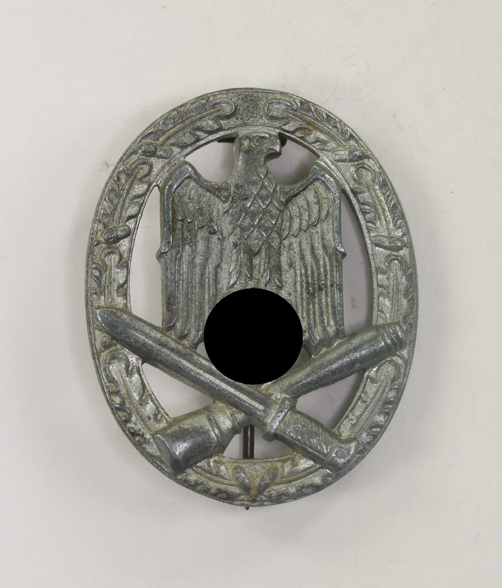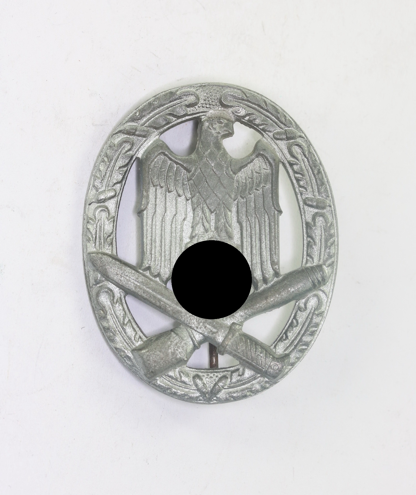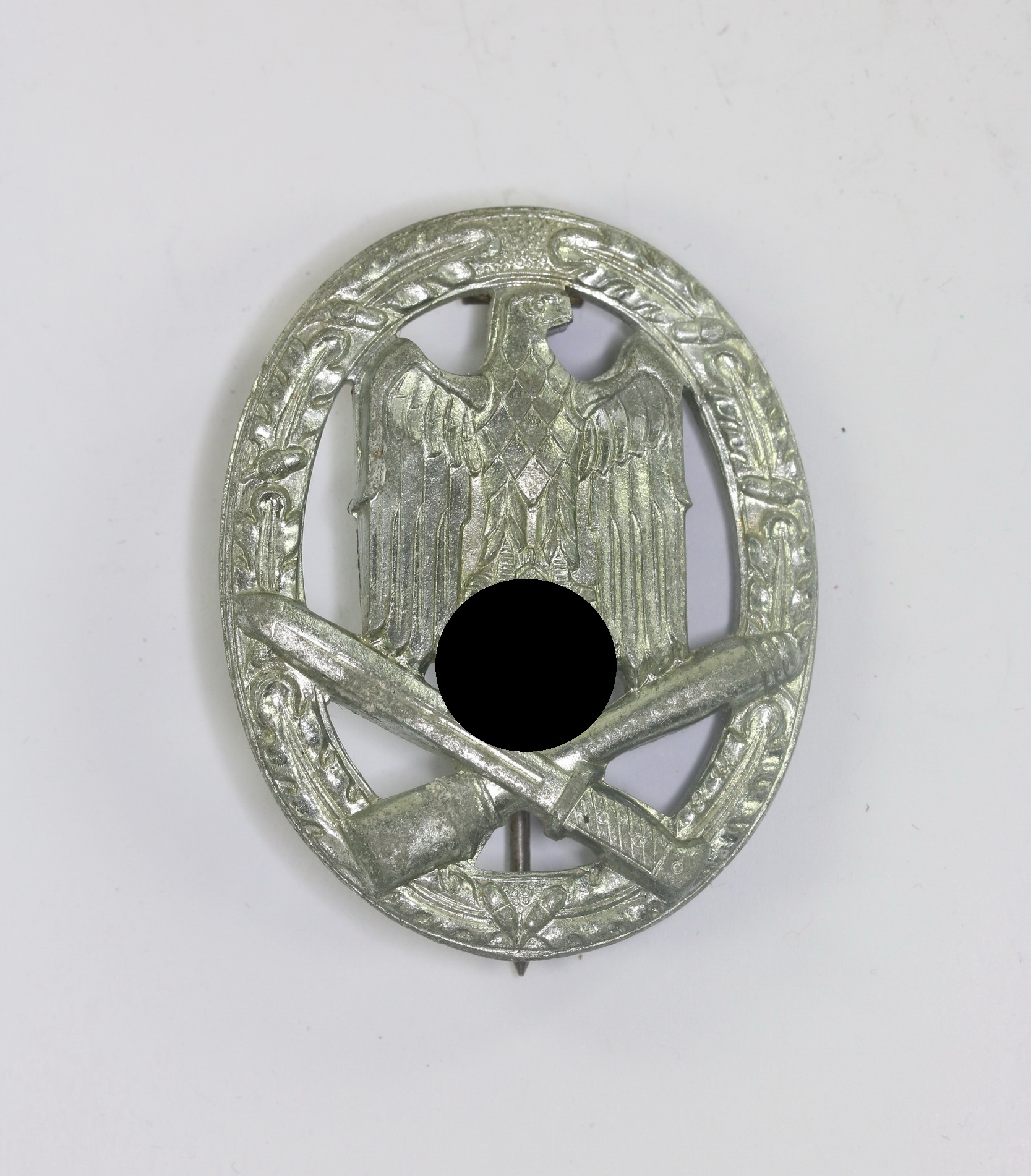 Zink, sehr guter, nur minimal getragener Zustand. Mit vollständiger Versilberung, mit minimalen Ansätzen von Patina. Ohne Hersteller, aber eine bekannte Variante der Firma Biedermann & Co., Oberkassel. Siehe GCA-Datenbank.