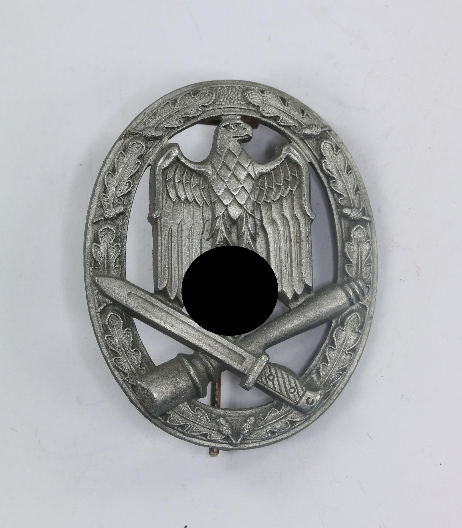 Zink, sehr guter, leicht getragener Zustand. Die Versilberung fast vollständig vergangen. Ohne Hersteller, aber eine bekannte Variante der Firma C.E. Juncker, Berlin. Siehe GCA-Datenbank.
