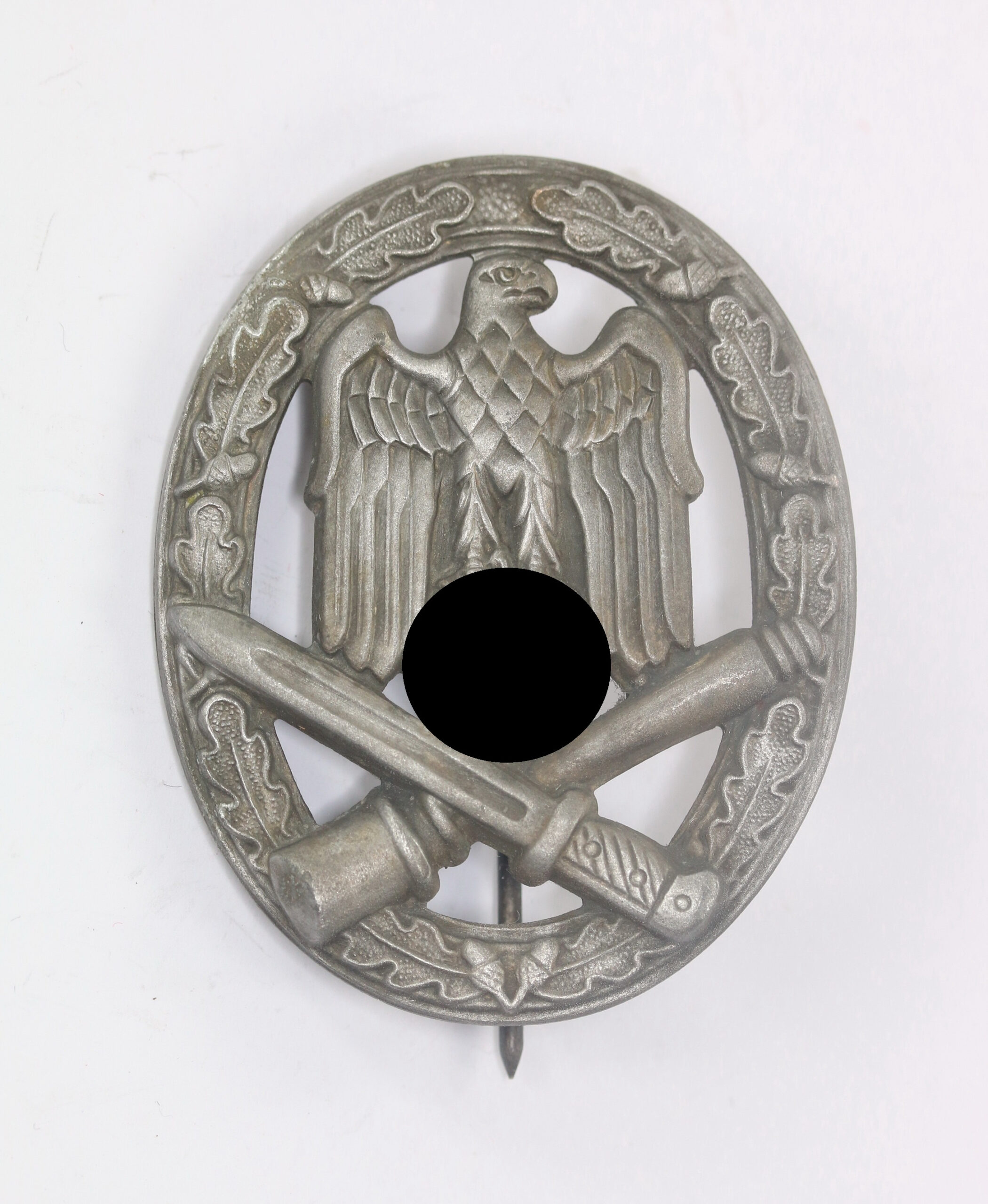 Zink, sehr guter, nahezu ungetragener Zustand. Mit vollständiger Versilberung. Mit Hersteller „R.S.“ und „L/58“, beide für die Firma Rudolf Souval, Wien.Siehe GCA-Datenbank. An kurzer Nadel.