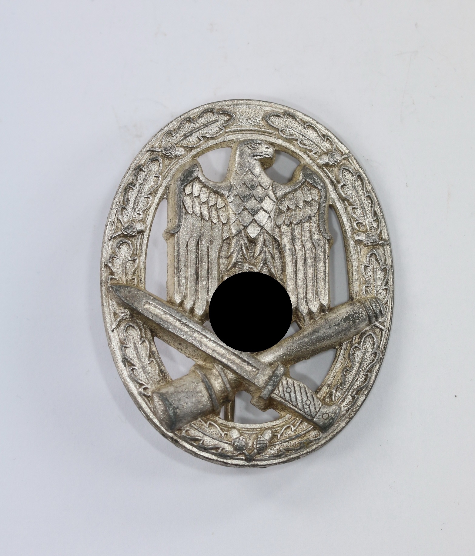 Zink, sehr guter, nahe zu ungetragener Zustand. Mit vollständiger frostiger Versilberung. Hakenkreuz und Kanten poliert. Mit leichten Ansätzen von Patina. Ohne Hersteller, aber eine bekannte Variante der Firma Metall und Kunstharzwerk, Komotau / Sudetengau (Typ 1.31.1). Siehe GCA-Datenbank.