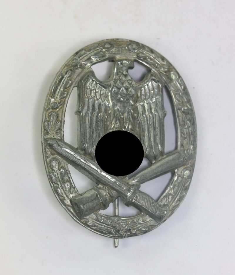 Zink, sehr guter, leicht getragener Zustand. Mit noch schöner Versilberung, mit leichter Patina. Ohne Hersteller Markierung, aber eine bekannte Variante der Firma Rudolf Karneth aus Gablonz. Siehe GCA-Datenbank. Mit typischen, eingequetschten Nadelsystem.