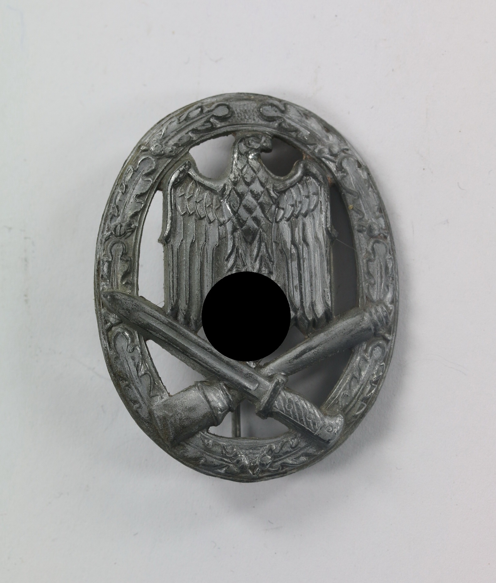 Zink, sehr guter, leicht getragener Zustand. Mit vollständiger Versilberung und leichter Patina. Ohne Hersteller, aber eine bekannte Variante der Firma Rudolf Karneth, Gablonz. Siehe GCA-Datenbank