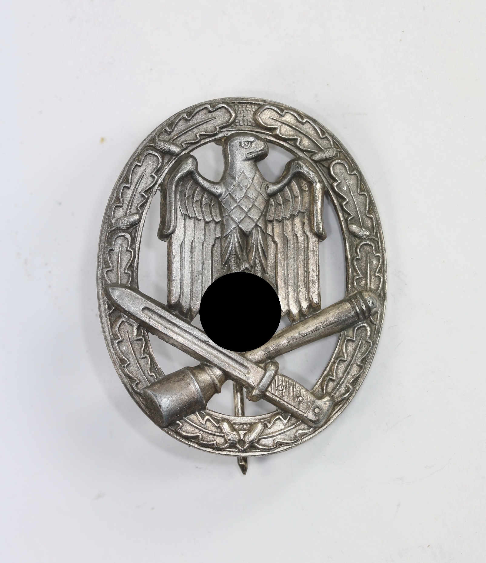 Zink, sehr guter, nur minimal getragener Zustand. Mit vollständiger, typischer Versilberung. Ohne Hersteller, aber eine bekannte Variante der Firma Schauerte & Höhfeld, Lüdenscheid . Siehe GCA-Datenbank.
