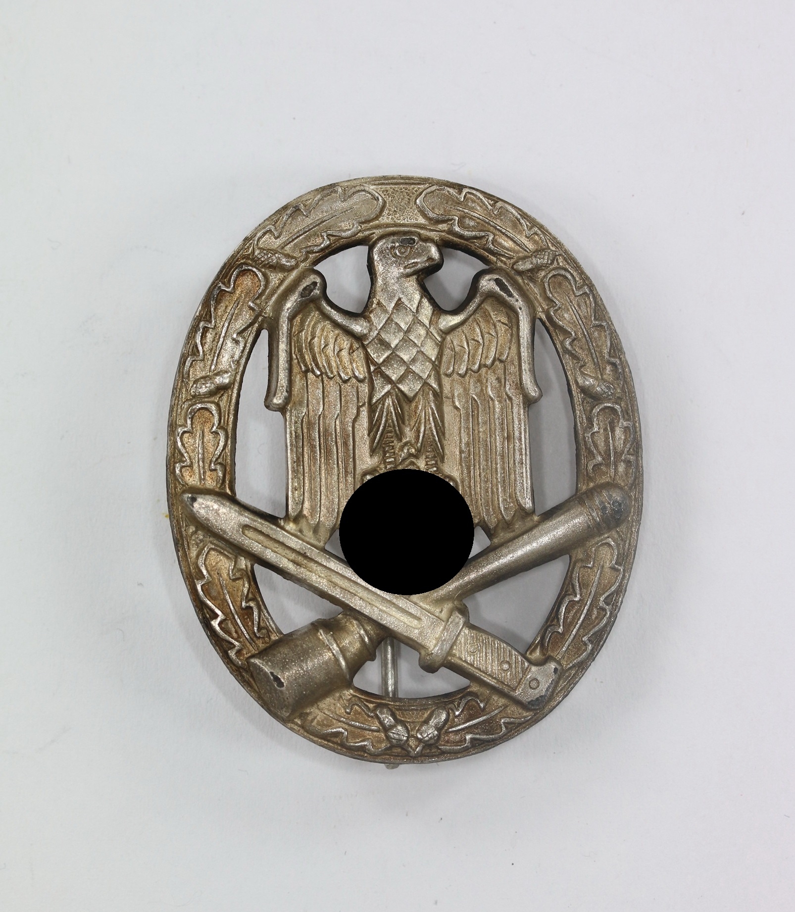 Zink, sehr guter, nahe zu ungetragener Zustand. Mit vollständiger Versilberung, Hakenkreuz und Kanten poliert. Mit leichter Patina. Ohne Hersteller, aber eine bekannte Variante der Firma Schauerte & Höhfeld, Lüdenscheid. Siehe GCA-Datenbank. Mit Variante beim nadelhaken mit runder(!) Grundplatte!
