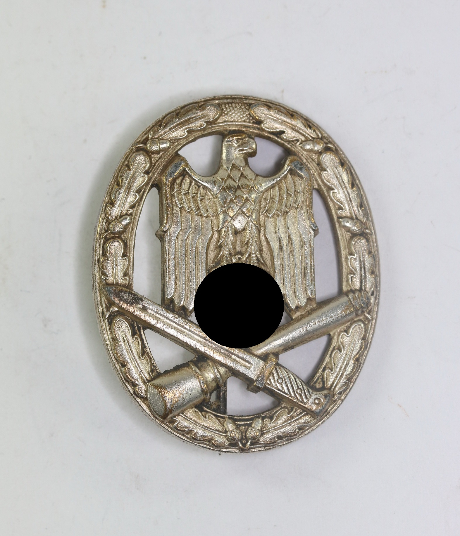 Zink, sehr guter, nahezu ungetragener Zustand. Mit vollständiger Versilberung. Ohne Hersteller, aber eine bekannte Variante der Firma Steinhauer & Lück, Lüdenscheid. Siehe GCA-Datenbank. Mit der markannten ovalen Platte unter den Nadelhaken.