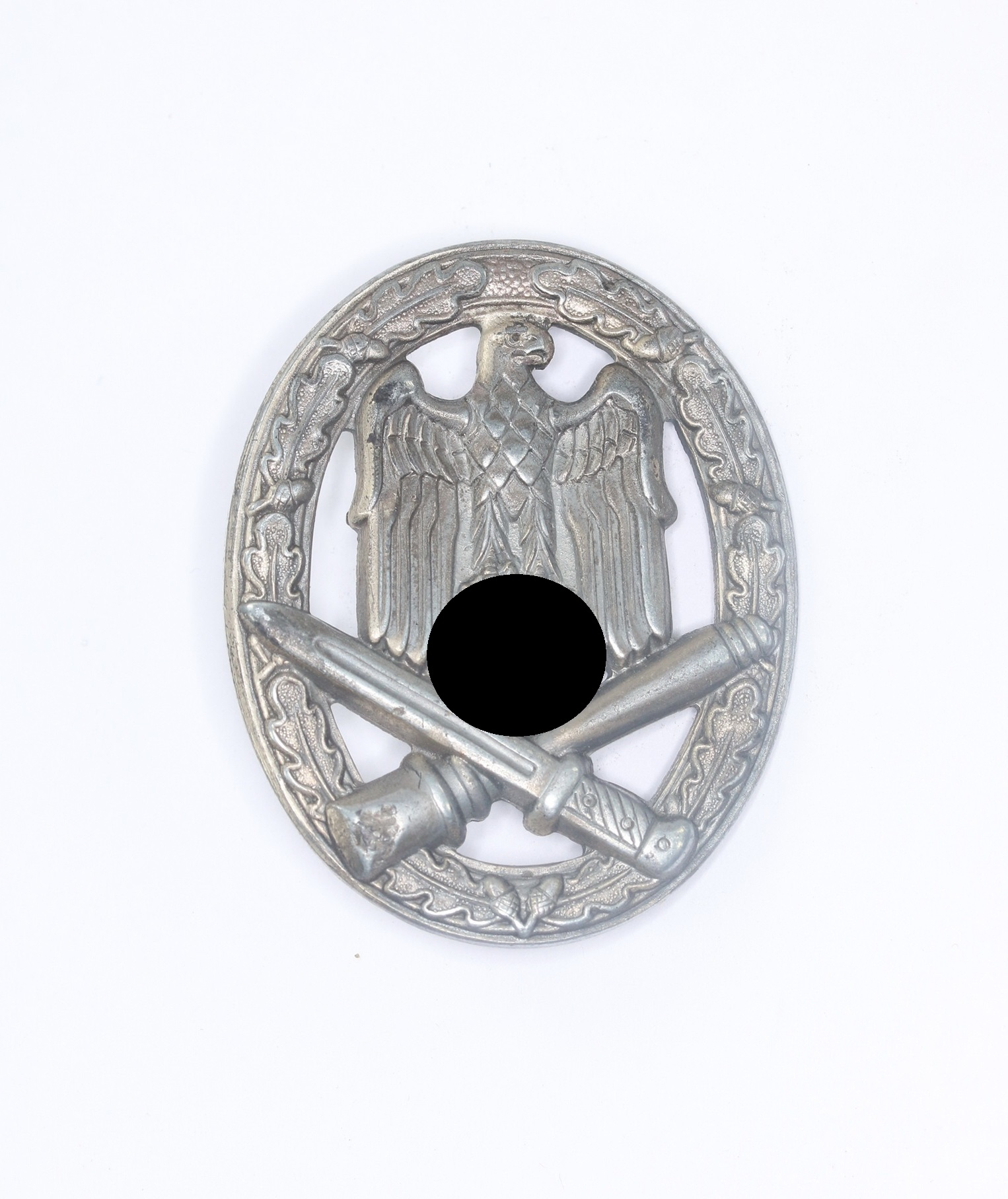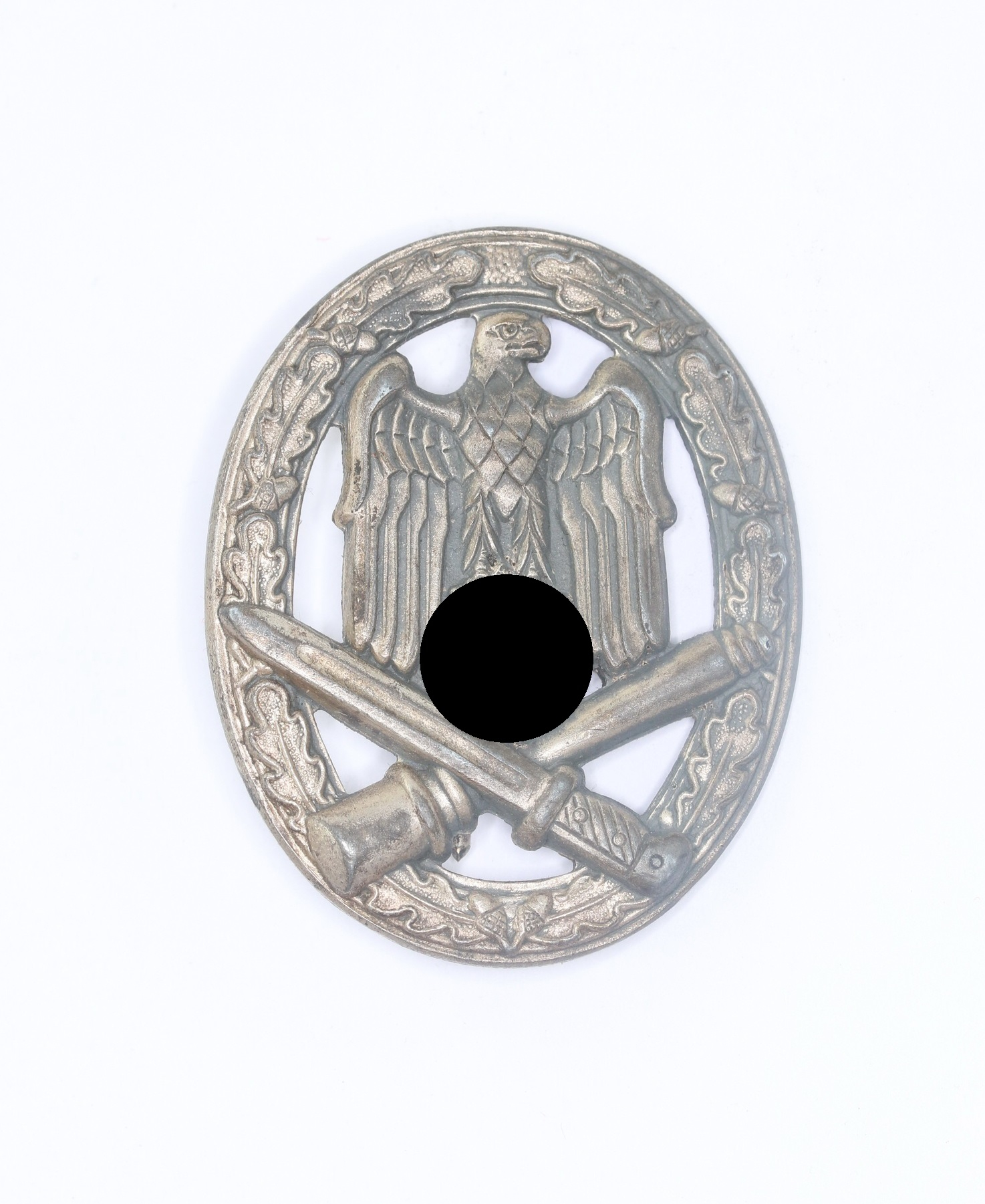 Zink, sehr guter, nur leicht getragener Zustand. Mit fast vollständiger Versilberung, mit leichter Patina. Ohne Hersteller, aber eine bekannte Variante der Firma Wilhelm Hobacher, Wien. Siehe GCA-Datenbank.