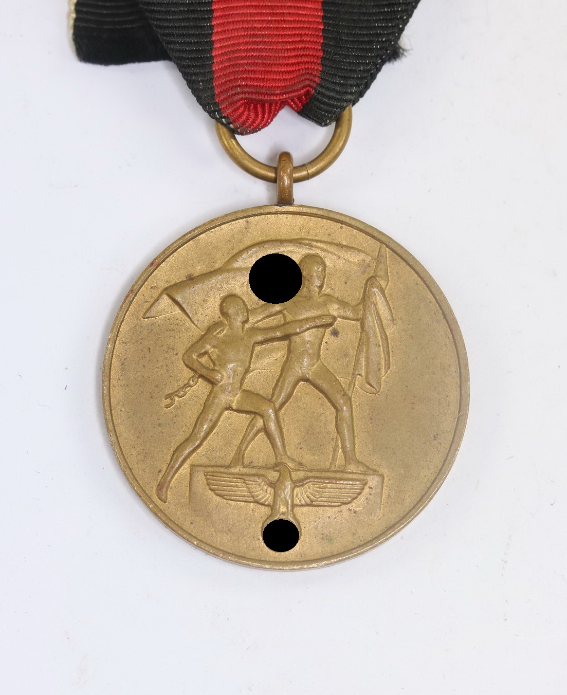 Buntmetall bronuiert, sehr guter, nur minimal getragener Zustand. Ohne Hersteller, aber eine bekannte Variante. Am originalen Trageband.