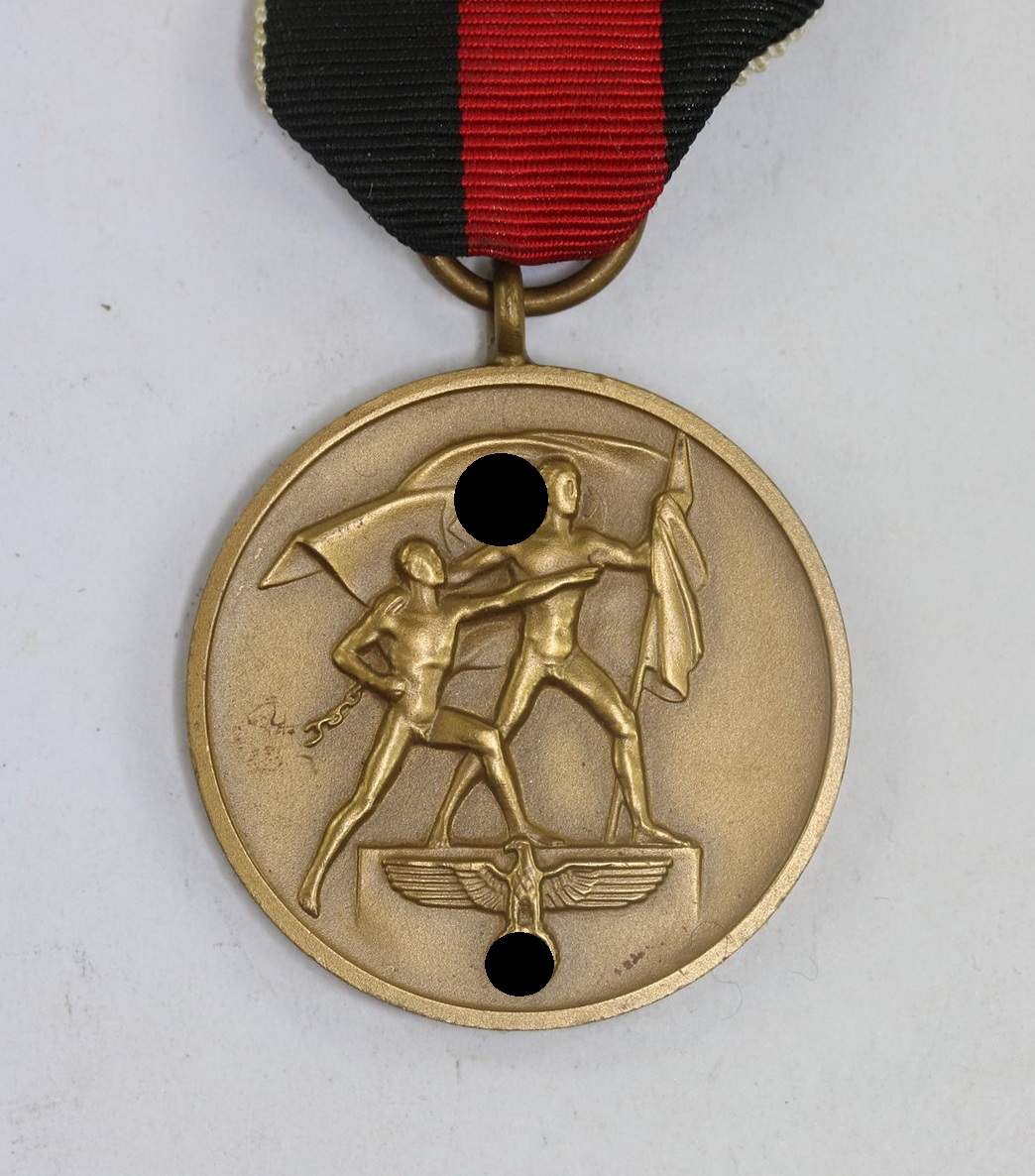 Die Anschlußmedaille aus Buntmetall, bronziert, sehr guter, ungetragener Zustand. Mit vollständiger Bronzierung. Ohne Hersteller Markierung, aber eine bekannte Variante. An originalen Trageband. Vorderseitig zwei nackte Männer nach rechts gewannt, der linke mit einem Stück Kette an der Hand (Symbol der gesprengten Ketten), der rechte mit Hakenkreuz Fahne in der Hand. Über Hoheitsadler mit auf der Spitze stehenden Hakenkreuz in den Fängen.