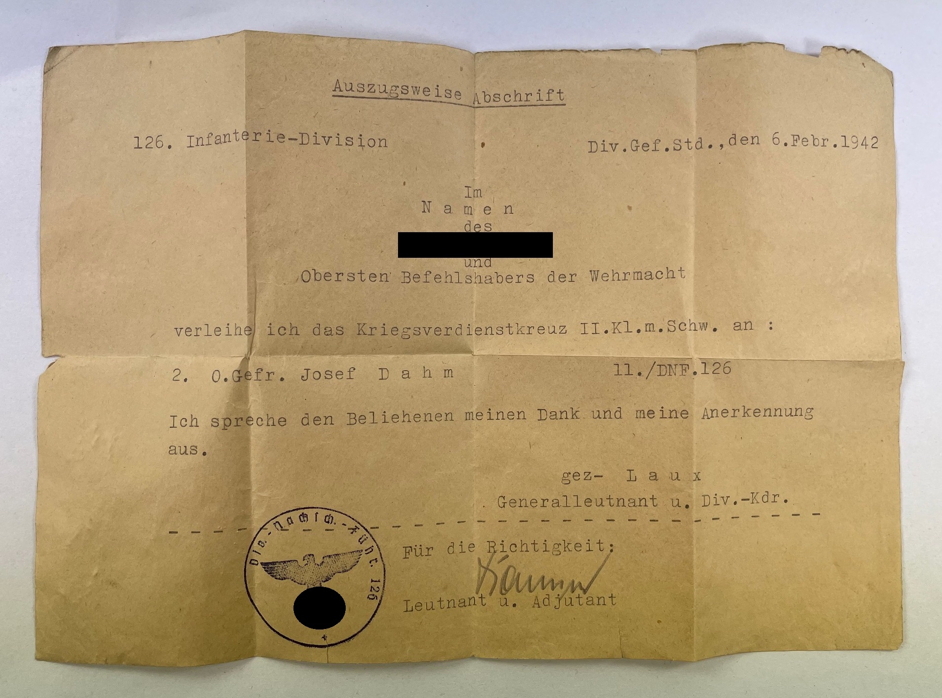 Auszugsweise Abschrift, Kriegsverdienstkreuz 2. Klasse mit Schwertern