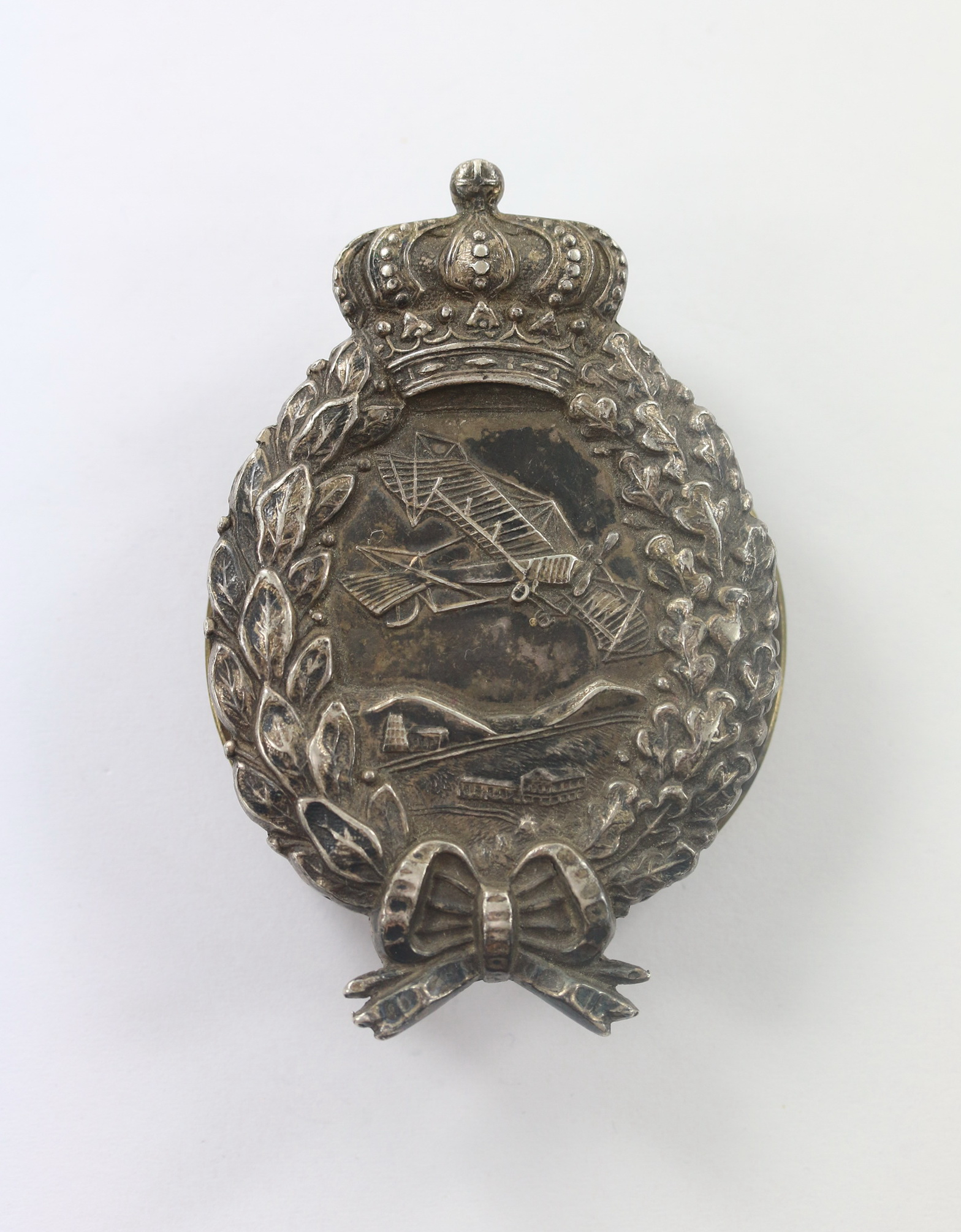 Silber (800), hohlgeprägt und verbödet. Vom Träger mit Frontmitteln auf Schraube und Mutter umgebaut, sonst sehr guter, getragener Zustand. Mit sehr schöner, unberührter Patina. Ohne Hersteller, aber ein typisches Abzeichen der Firma Karl Pöllath Schrobenhausen. Siehe Carsten baldes, Abzeichen und Ehrenpreise der Fliegertruppe von 1913 bis 1920.