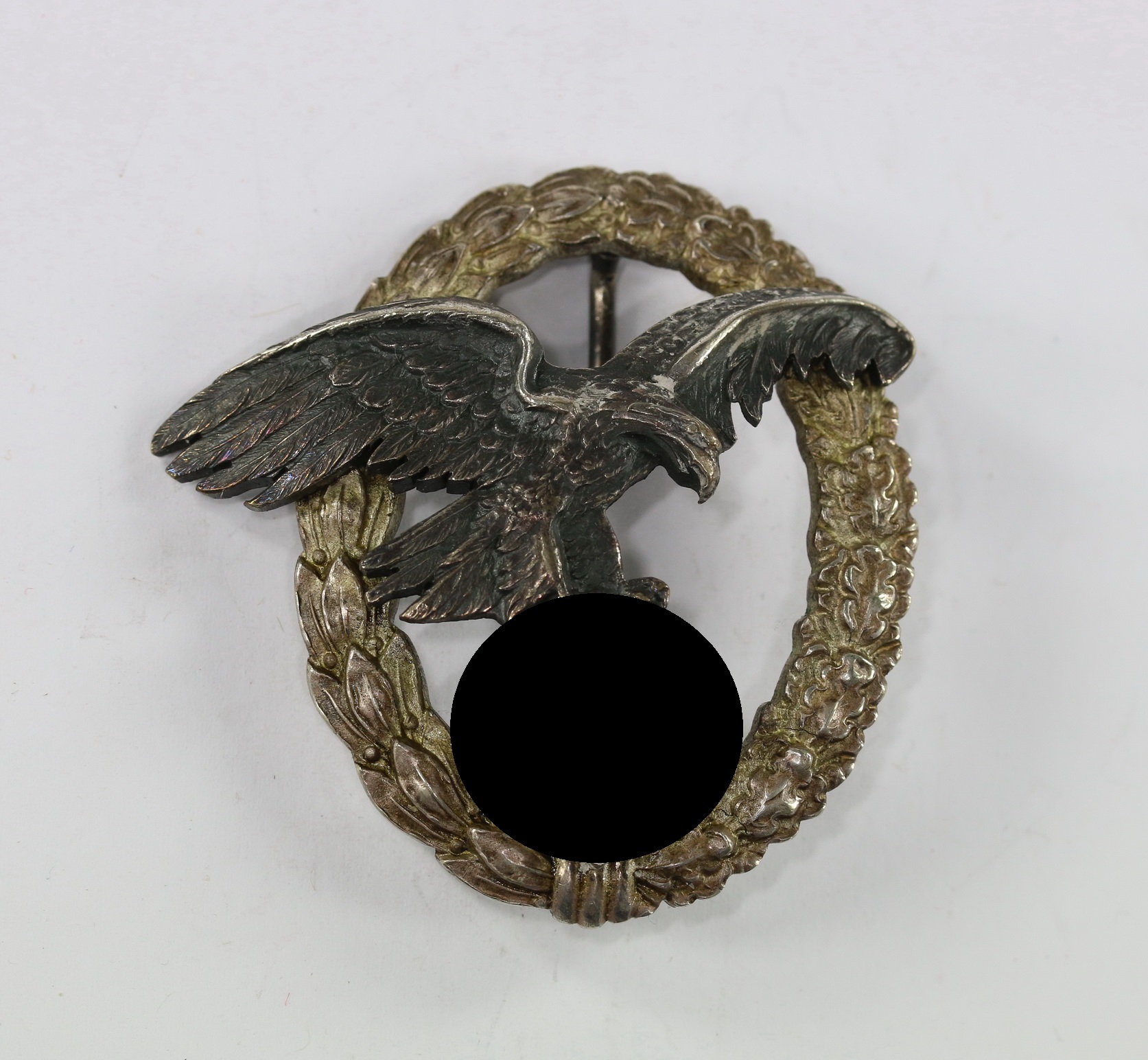 Sehr guter, nur minimal getragener Zustand. Der Kranz mit vollständiger, frostiger Versilberung. Der Adler mit vollständiger, dunkler Tönung. Mit sehr schöner, unberührter Patina. Mit Hersteller „C.E. Juncker BerlinSW“. Das erste, flache Modell der Firma Juncker (J.1).
