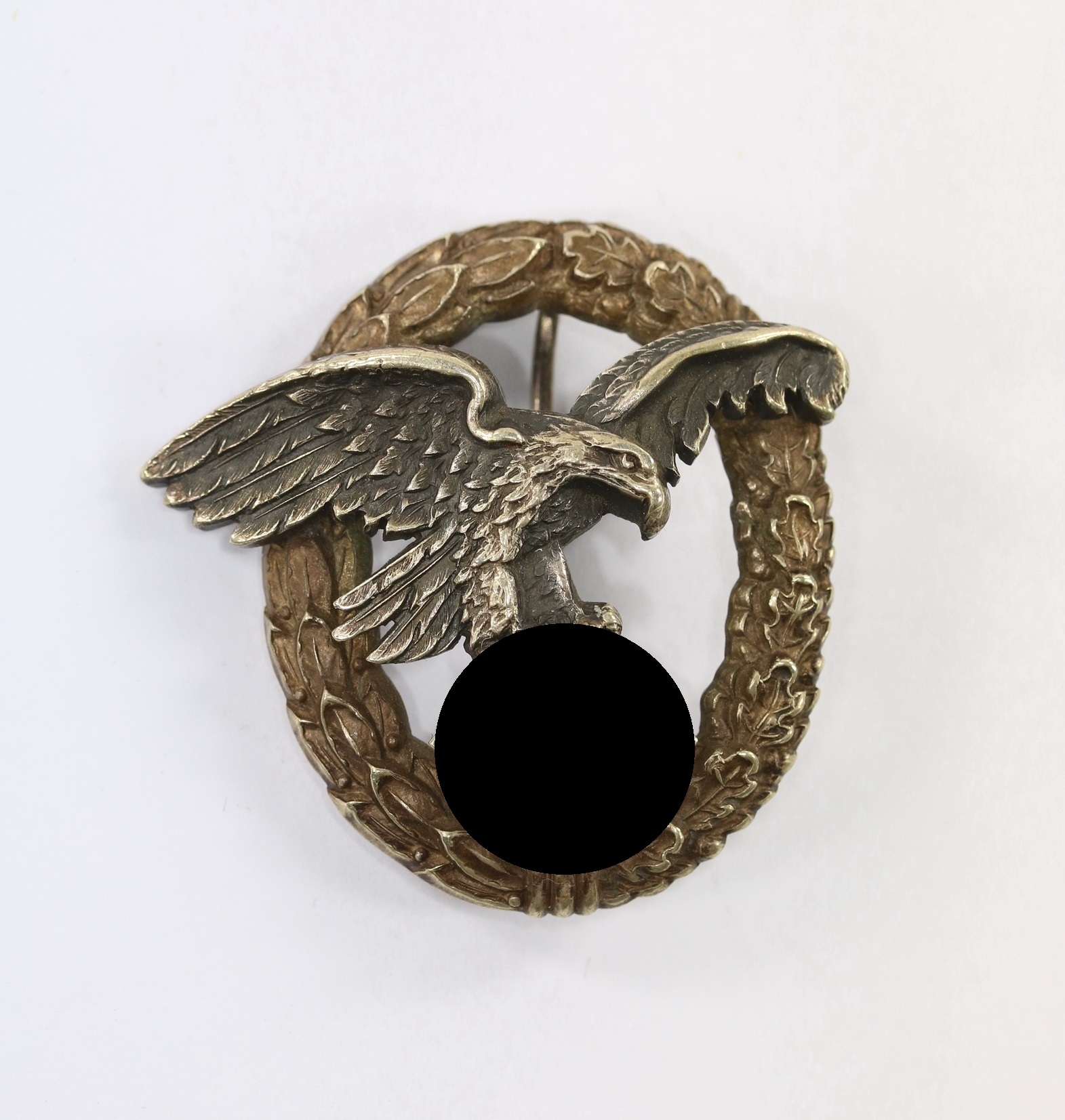 Buntmetall, sehr guter, leicht getragener Zustand. Der Kranz mit vollständiger Versilberung, der Adler mit fast vollständiger Tönung. Mit unberührter Patina. Mit Hersteller „P. Meybauer Berlin“.