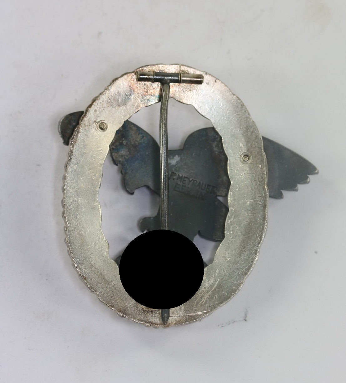 Buntmetall, sehr guter, nahezu ungetragener Zustand. Der Kranz mit vollständiger, frostiger Versilberung, der Adler mit vollständiger Tönung. Rückseitig zentral auf dem Adler die Hersteller Markierung „P. Meybauer Berlin“.