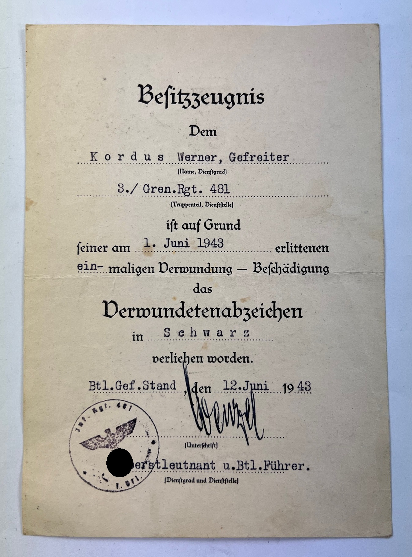 Besitzzeugnis Verwundetenabzeichen in Schwarz 1939, Grenadier Regiment 481