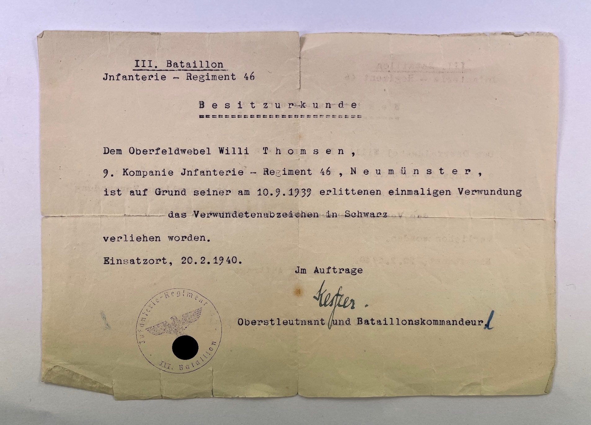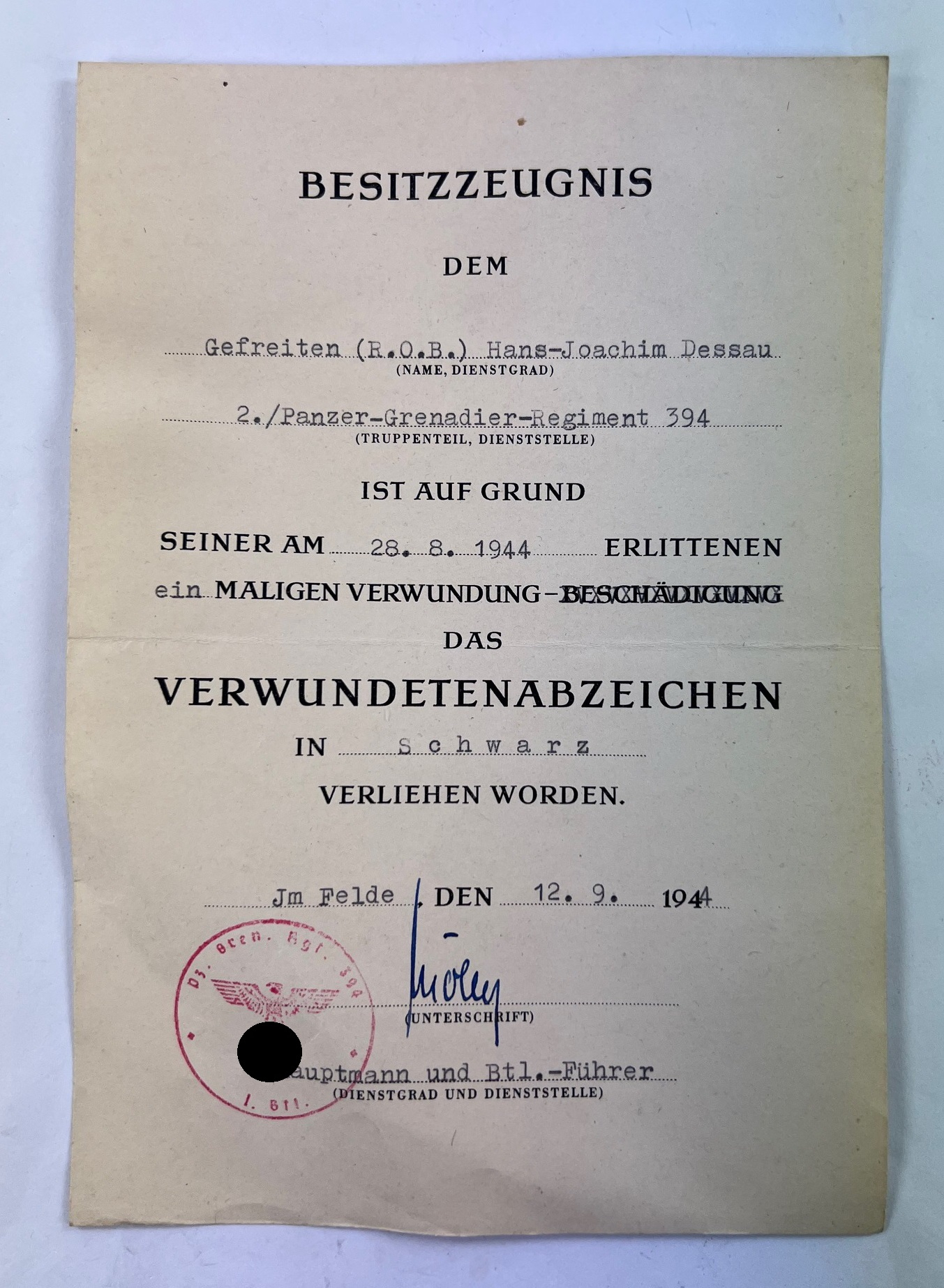 Besitzzeugnis Verwundetenabzeichen in Schwarz 1939