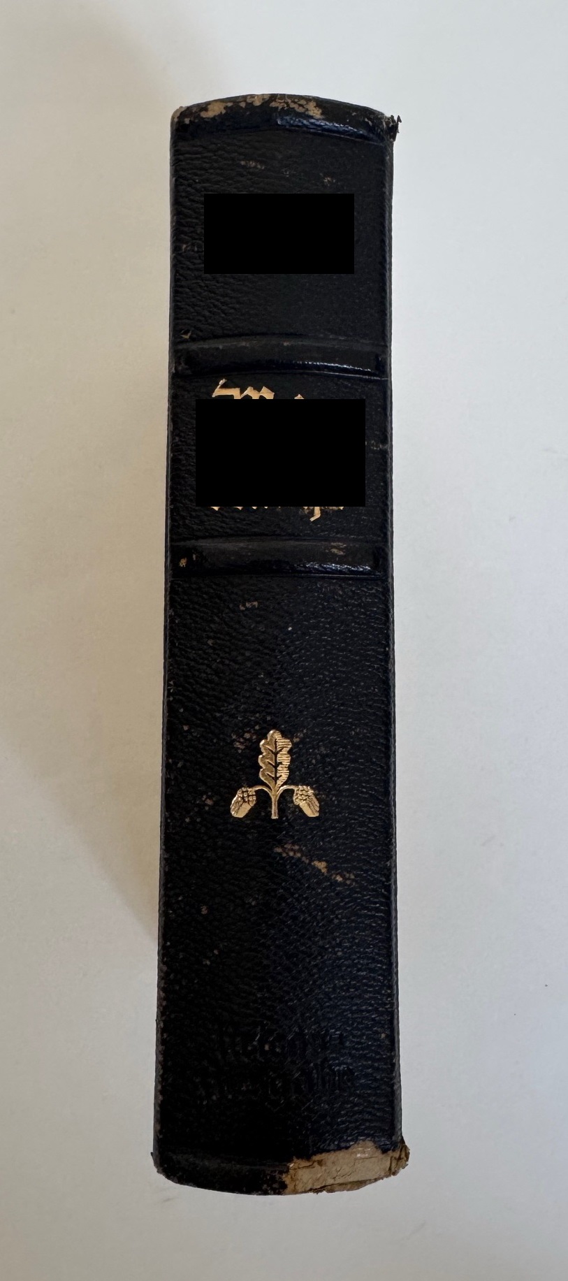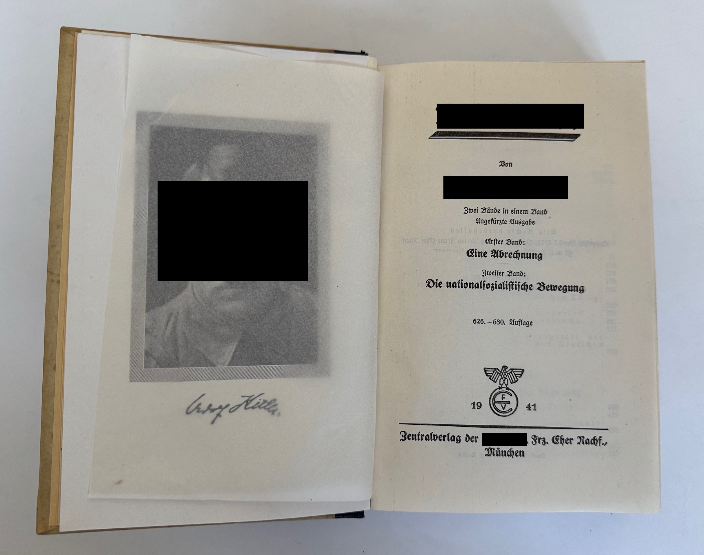 Sehr guter, nur minimal gebrauchter Zustand. Vollständig 781 Seiten mit Führerbild und Seidenpapier. Zentralverlag der NSDAP. Franz Eher Nachf. München 1939, 464. – 468.. Auflage. Außen mit in Gold eingeprägten Stadtwappen der Stadt Bad Kreuznach.