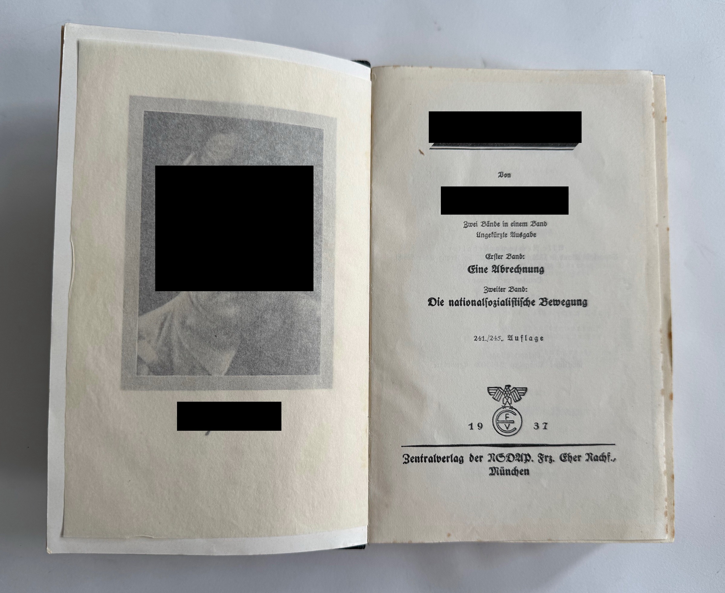 Das Buch in einen sehr guten, nur minimal gebrauchten Zustand. Vollständig 781 Seiten mit Führerbild, Seidenpapier und Widmungsblatt der Stadt Leverkusen. Zentralverlag der NSDAP. Frz. Eher Nachf. München 1937, 241. / 245.. Auflage. Außen mit in Gold eingeprägten Stadtwappen der Stadt Leverkusen, darüber in Gold „Stadt Leverkusen“.