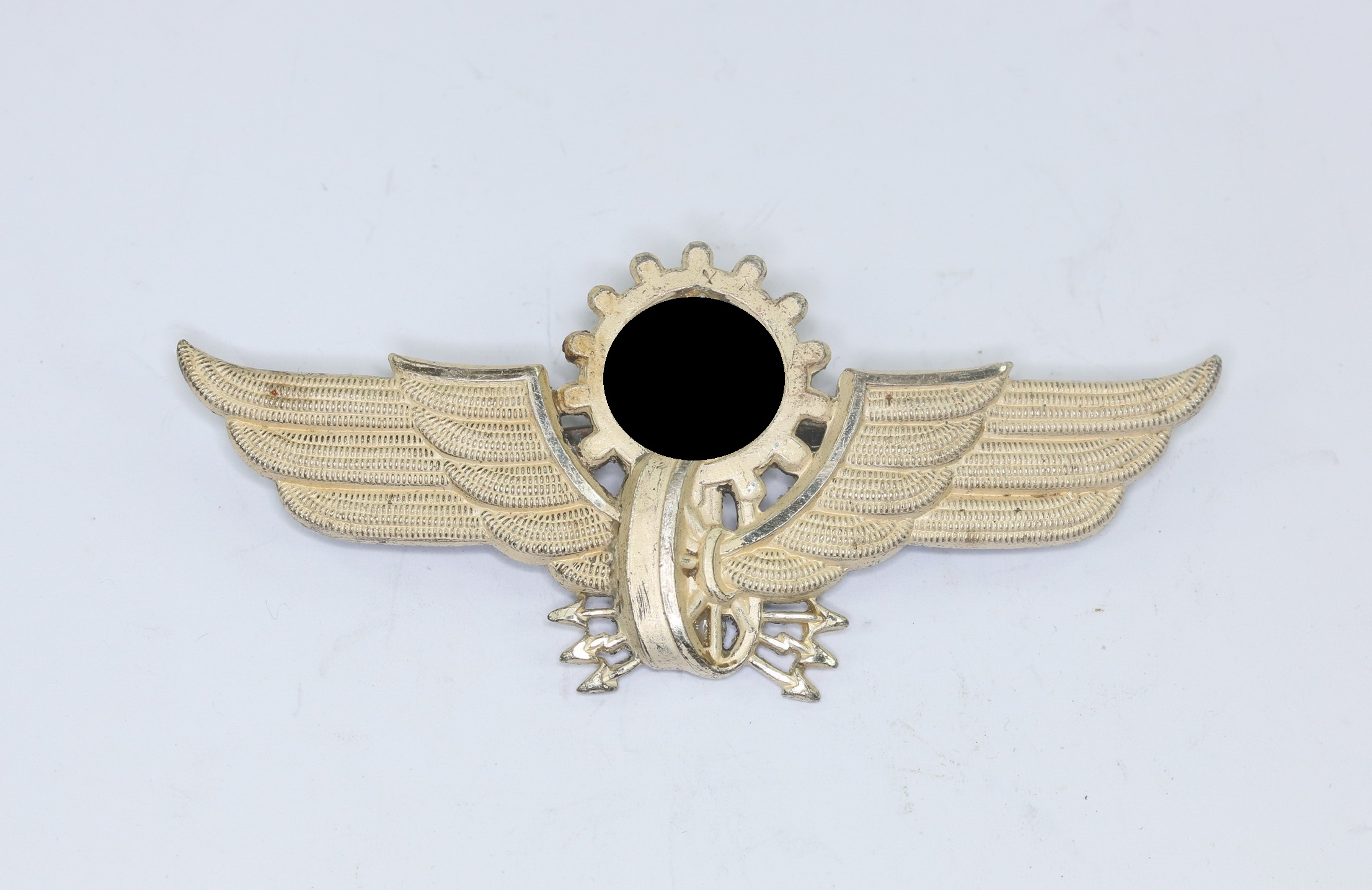 Buntmetall, frostig versilbert, serh guter, nahezu ungetragener Zustand. Mit vollständiger versilberung, die Kanten poliert. Mit leichten Ansätzen von Patina. Rückseitig die beiden Splinte einwandfrei.
