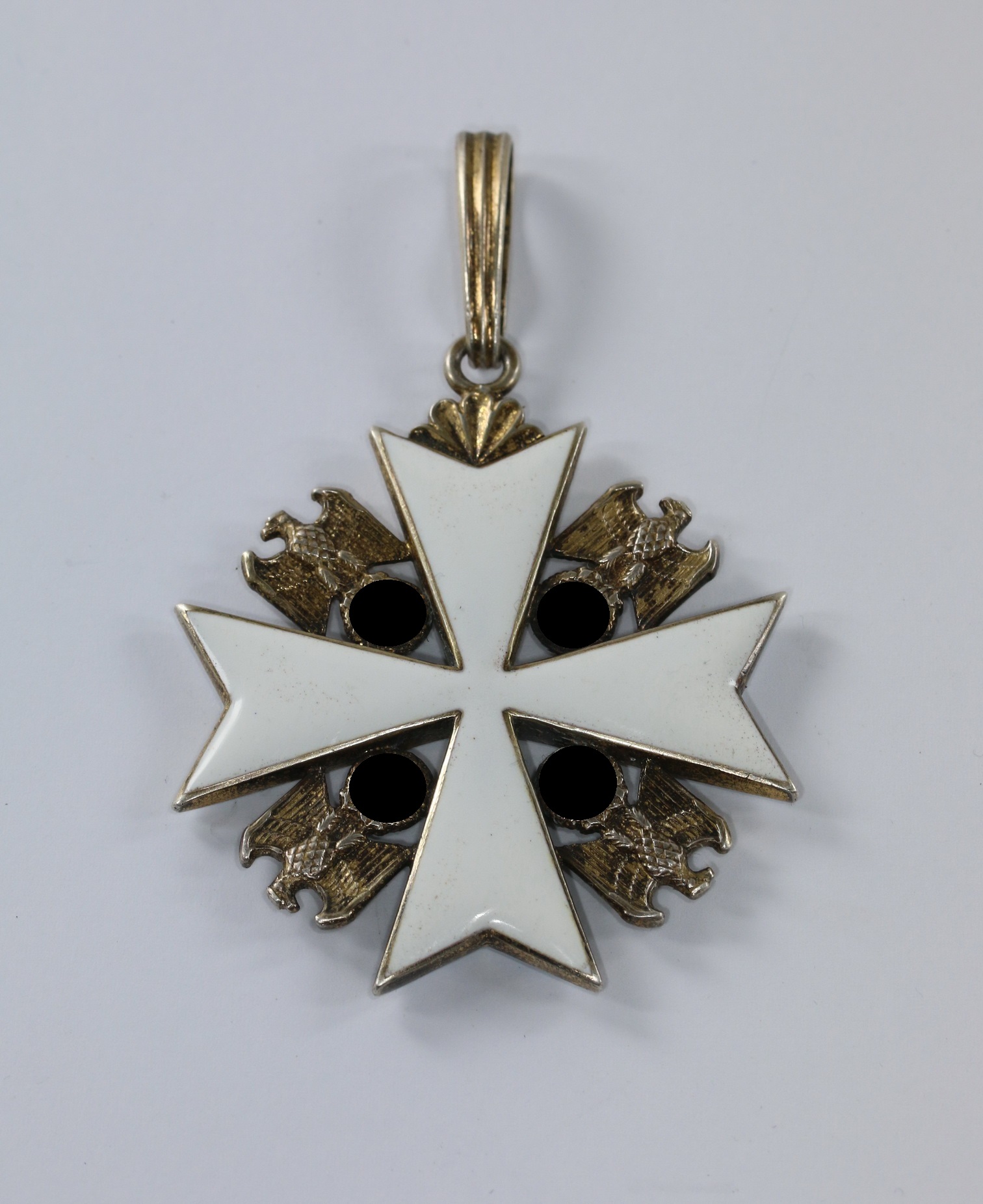 Silber (900), vergoldet, sehr guter, leicht getragener Zustand. Die Emaille auf der Rückseite teilweise restauriert(!). Mit leichter Patina. Mit Hersteller „21“ für die Firma Gebrüder Godet & Co., Berlin und der Silber Punze „900“. Das Halskreuz ohne Bruststern getragen stellt die 3. Klasse des Deutschen Adlerorden da, mit Bruststern getragen stellt es die 2. Klasse da. Maße 50 x 50 mm.