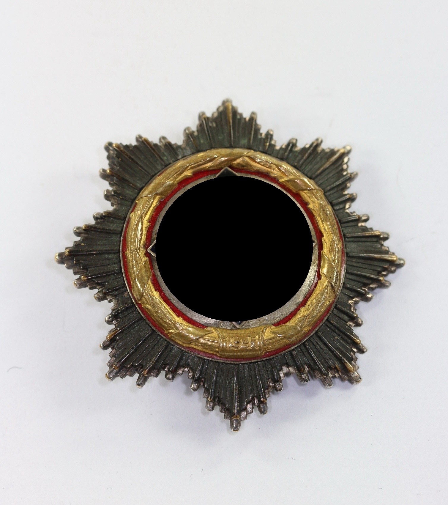 Schweren Tombak Stück (65,5 g), sehr guter, minimal getragener Zustand. Die Emaille mit minimalen Tragespuren, aber ohne Fehler. Der Spiegel mit vollständiger, frostiger Versilberung, der Kranz mit vollständiger, strahlender Vergoldung. Der Strahlenkranz mit vollständiger dunkler Tönung, die Grundplatte mit vollständiger Versilberung, die Kanten poliert. Mit feiner, unberührter Patina. Ohne Hersteller, aber eine bekannte Variante der Firma Deschler & Sohn, München (1). Siehe Dietrich März, Das Deutsche Kreuz.